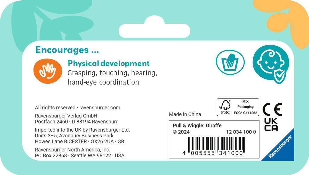 This colourful giraffe activity toy will keep baby entertained whilst on-the-go. Multisensory details will keep little fingers busy, and the contrasting colours offer engaging visual stimulation. Baby will love activating the wiggle motion by pulling the giraffe, while the bright ribbons and soft leaves introduce a variety of textures to explore. The Pull & Wiggle Giraffe is great for anytime play, and the handy clip makes it easy to take the fun along wherever you go!