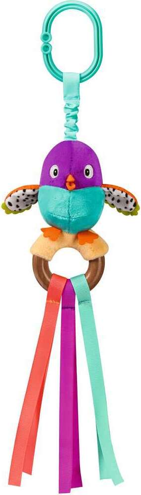This loveable birdie will become a staple while on the go with your baby. Multisensory details will keep little fingers busy, and the contrasting colours offer engaging visual stimulation. Baby will love to grasp the long, soft and colourful ribbons or the birdie’s wooden ring perch. As the bird is moved or shaken, hear cute chirping sounds that are sure to make baby giggle. Shake & Chirp Bird is great for anytime play, and the handy clip makes it easy to take the fun along wherever you go!