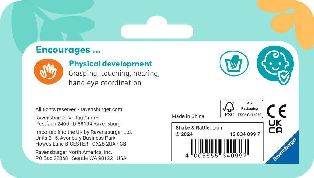 This colourful lion activity toy will keep baby entertained whilst on the go. Multisensory details will keep little fingers busy, and high-contrast colours offer engaging visual stimulation. Baby will love to shake the friendly lion to hear rattle sounds, and the bright ribbons or soft mane of this friendly lion are fun to grasp and explore. There are gentle crinkle sounds to be discovered when the plush leaf is played with too. Shake & Rattle Lion is great for anytime play, and the handy clip makes it easy to take the fun along wherever you go!