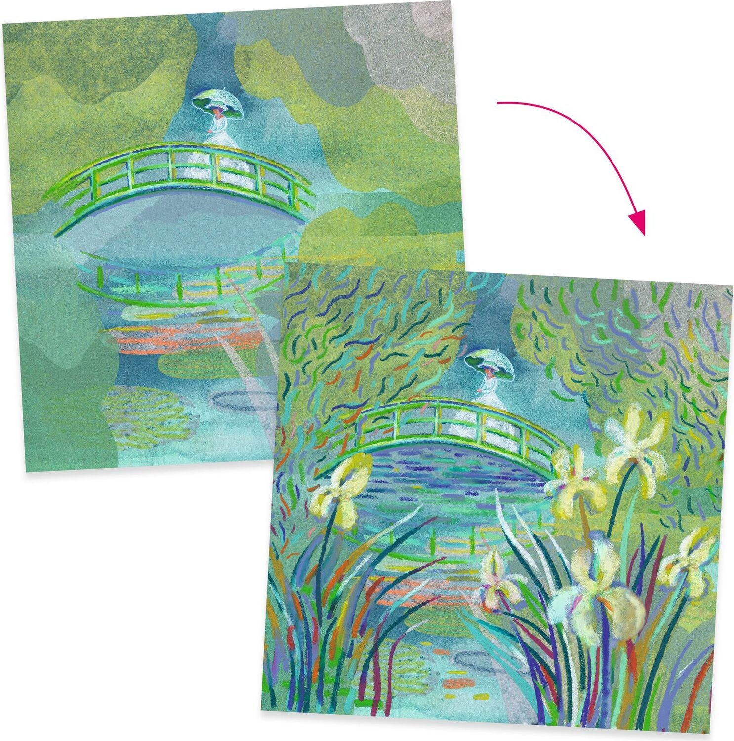 Inspired by the work of Claude Monet, Muriel Kerba offers us a triptych to complete in the impressionistic style worthy of the panoramic frescoes of Monet's Water Lilies, using touches of color with oil pastels.