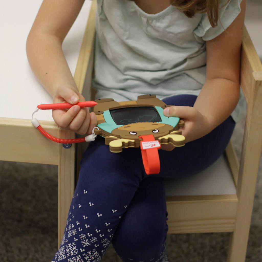 Kids can doodle with anything, including the attached stylus or even their fingernail. With the push of Morris’s nose, the doodle board instantly clears itself. There are no erase marks or wiping needed!