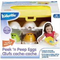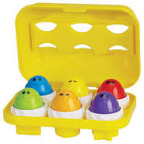 Little ones will have a ball with this toy! Lift off the eggshell to reveal a cute, colorful chick inside and press down on the chick to hear him squeak! The bottom of each egg contains a unique shape, sort the shapes to find the egg's home in the carton. For ages 12m and up.
