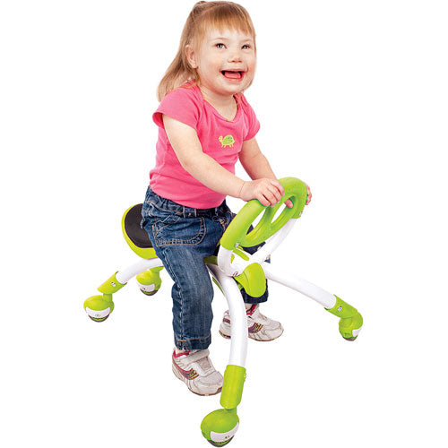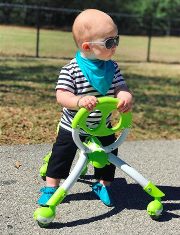 This cool little hybrid "walking buddy" is both stylish and functional. It's a grow-with-you, indoor/outdoor multi-directional ride for kids up to 44 lb that helps toddlers develop coordination and motor skills while fostering strength and balance in beginning walkers. Grasp the sturdy handle that looks like a smiling face, then take off walking and running or turn it around and sit comfy while pushing off with your feet and propelling yourself along. For ages 9-36 mos, from National Sporting Goods.