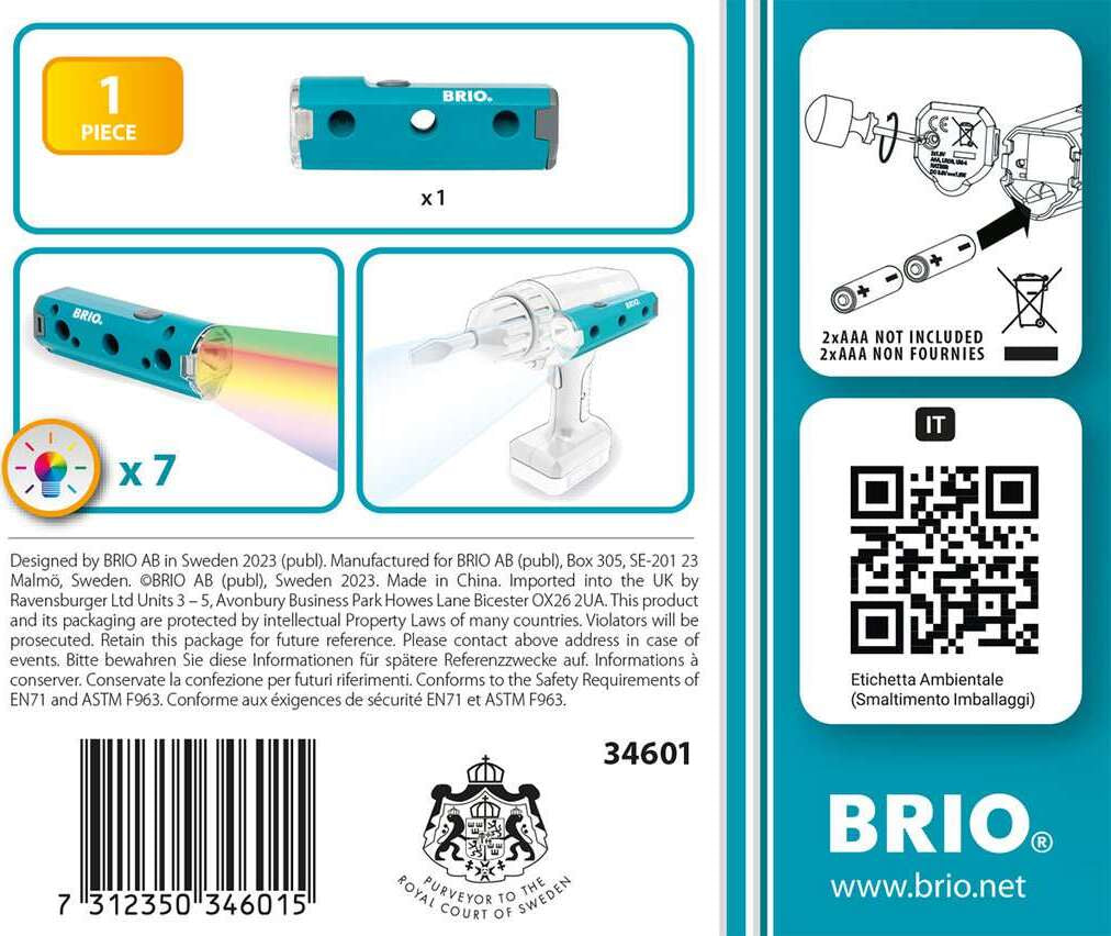 Brighten up your BRIO Builder play with the 34601 Flashlight. Fully compatible with BRIO Builder pieces, this handy flashlight can be attached to other Builder tools like the 34600 Power Screwdriver or be integrated into open-ended creations for imaginative and experimental play. A car light, a table lamp or a spotlight? What ideas can you create? With LED lamps that can shine in a wide range of colours, this toy flashlight shines brightly as you play.