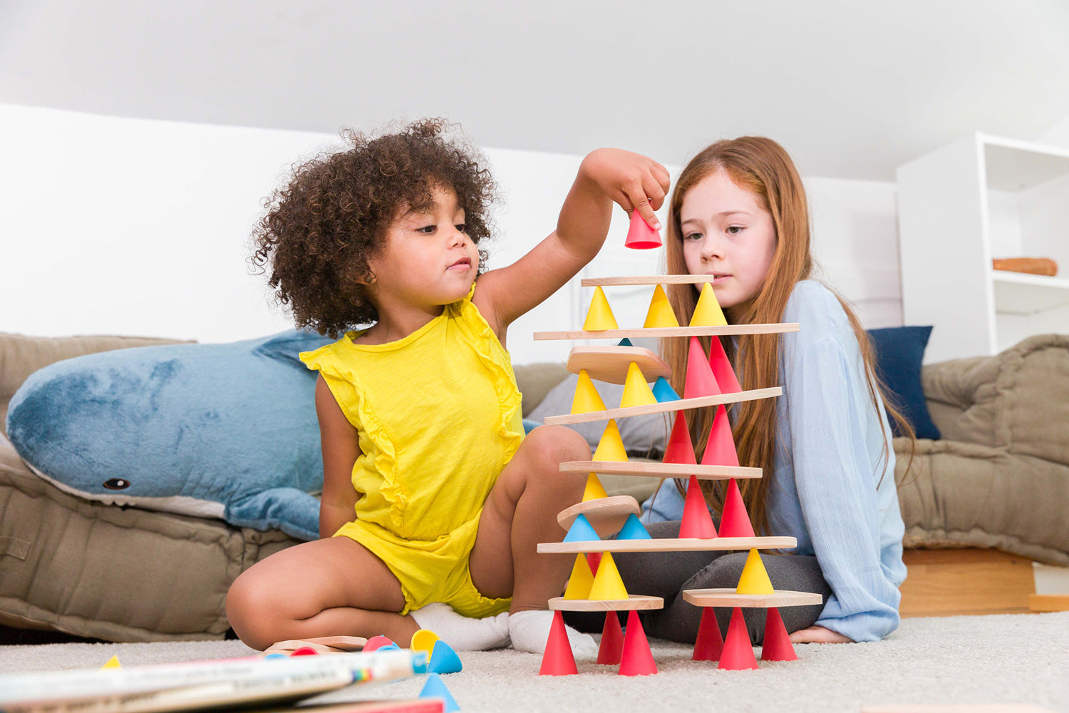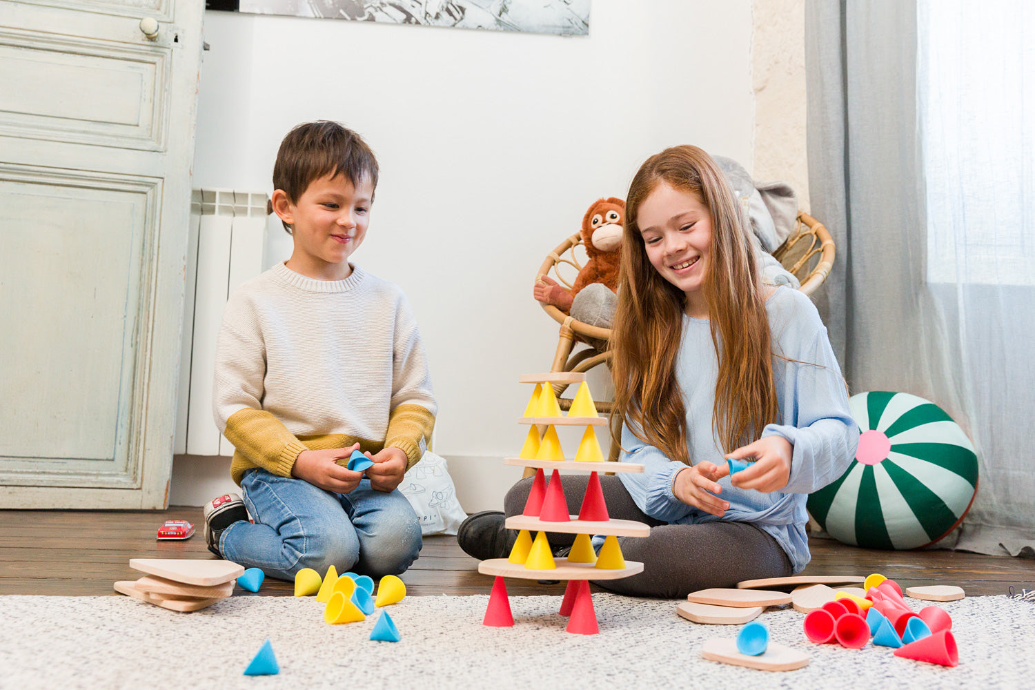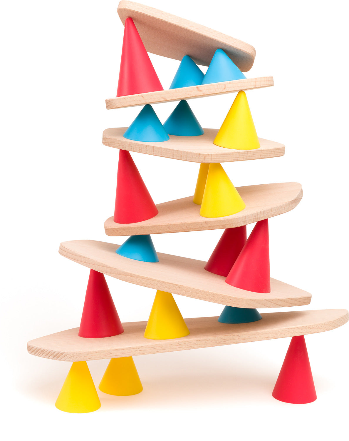 Discover Piks: a construction toy designed to stimulate children's development, concentration and creativity. Kids will love to stack the 18 silicone cones in three different sizes and colors, and balance the 6 solid beech wood boards into towers on top. It's an open-ended toy that is ideal for competitive or cooperative play, or even solo building. Kids can follow the included challenge cards to reproduce towers or create their own. Contains 24 pieces.