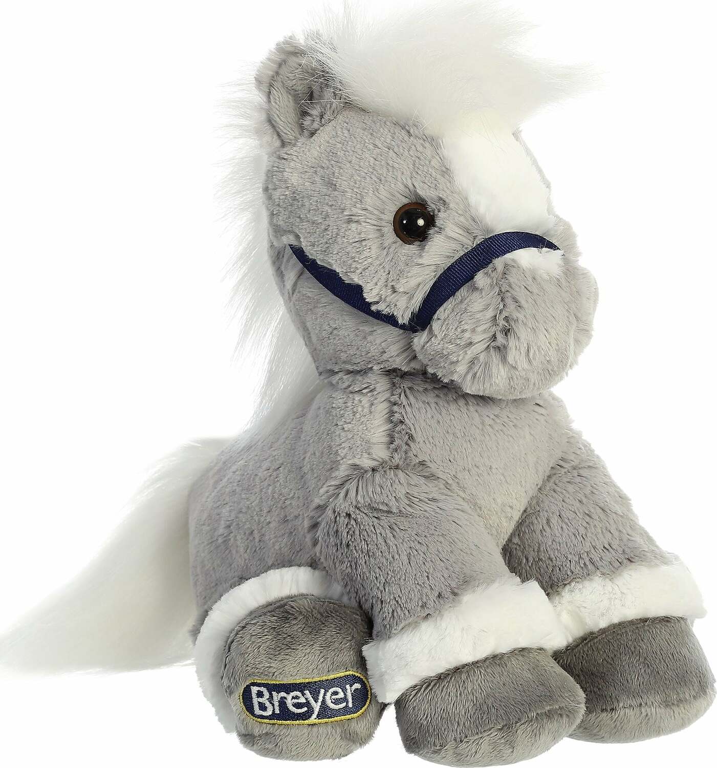 Breyer Bridle Buddies are sweet and cuddly. This grey horse has a cool grey coat with dark grey hooves and white accents around its legs. It also has "Breyer" embroidered on the bottom of its foot.