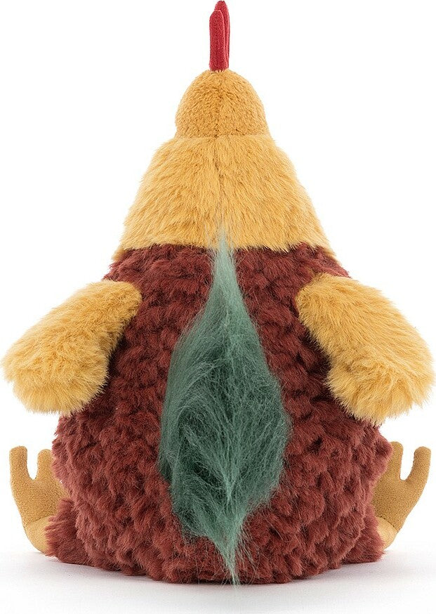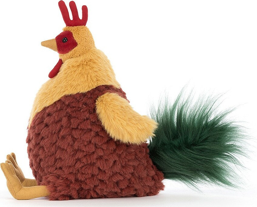 Proud and podgy, Cluny Cockerel is just like a big soft pineapple! This dizzy dandy has a tufty cocoa tum, custard bib and wings, and sunny suedey claws. Not to mention that fine scarlet wattle and comb, bold red eye mask and plumey green tail! A huggable hero!