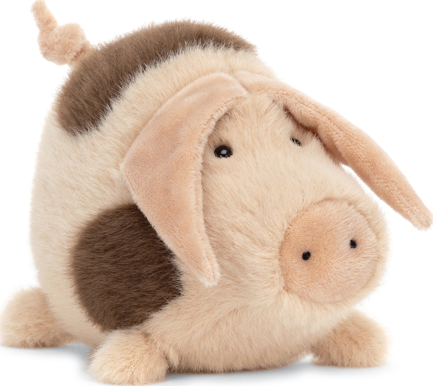 Higgledy Piggledy Old Spot is one curious pig! In sweet peachy pink with cocoa splotches, all a-totter on tiny trotters, this barnyard dandy snouts about everywhere. And what a fine, fuzzy snout it is! Just the handsome friend to take snuffling, rolling and rumbling!
