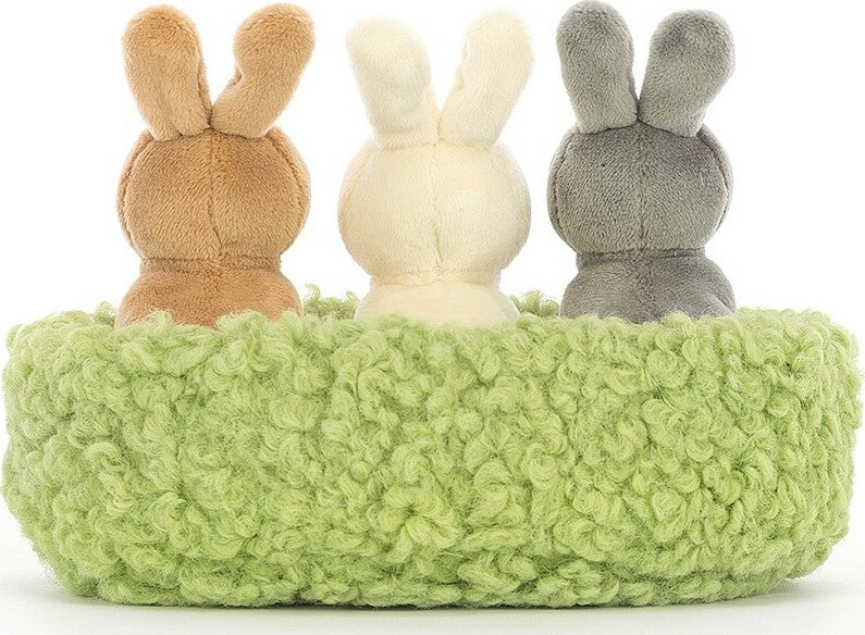 What's better than one cheery bunny? Three, all huddled together! The Nesting Bunnies are a tickly trio, in pebble, vanilla and tawny stretch fur. These perky poppets love to hang out in their fluffy mossy nest! With perky ears, eager expressions and snowy bobtails, this loveable litter can't wait to meet you!