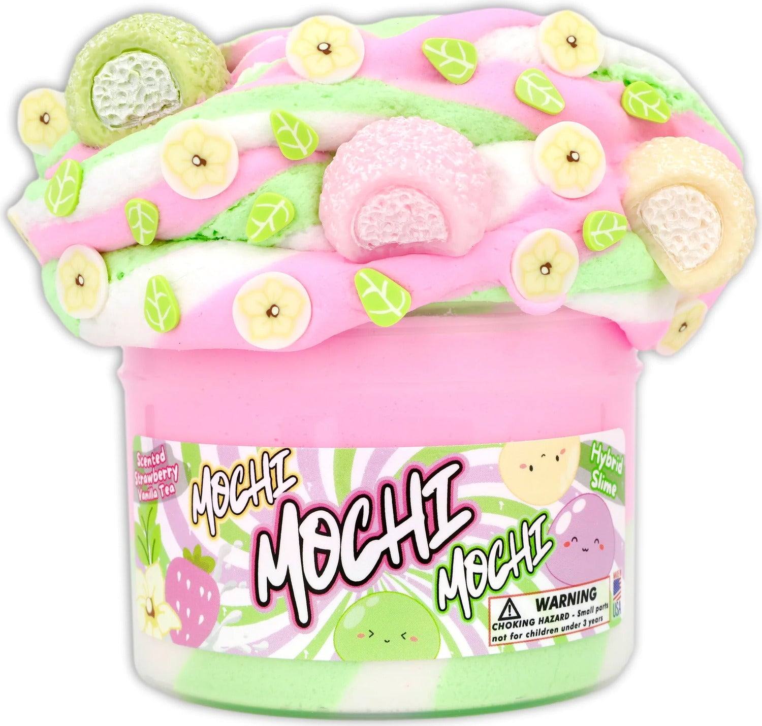 Get ready to satisfy your slime cravings with Dope Slimes' Mochi Mochi Mochi! This unique mochi themed hybrid slime features a green and white ice-cream layered base and a super soft pink butter slime topping. Complete with adorable mochi themed charms and fimo, this scented slime smells like strawberry vanilla tea mochi!
