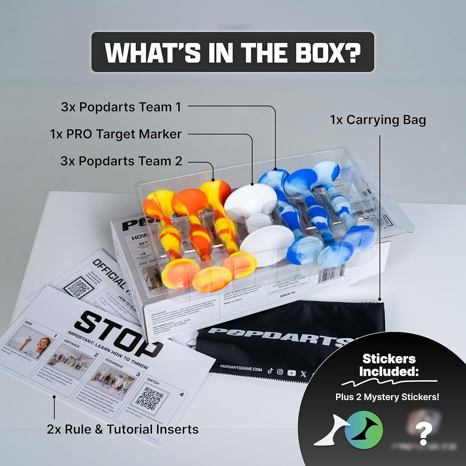 Level up family time with Popdarts: an extremely fun new game using silicone suction cup darts! This Pro Pack is built for competitive play and trick shots. Attach the target marker to any flat, smooth surface (indoors or outdoors), and take turns throwing your 3 darts from at least 10' away. The dart closest to the target earns 3 points, every other dart 1 point, and earn 10 points for landing on TOP of the target! Use cancellation scoring; the player with the most points wins the round, and first player to 21 points wins! Take turns moving the target between rounds. Popdarts land with a satisfying "thwack", and make a fun popping noise when removed! Pack everything in the carry bag to take Popdarts with you. For 2 players.
