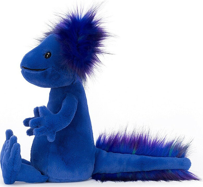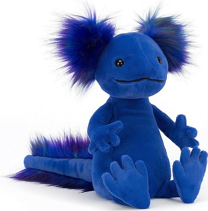 Andie Axolotl is a bold and bubbly scamp who loves to paddle in the river with those big bobbly feet! This funky blue friend comes from Mexico and rocks a rainbow of tufts in electric purple, green and indigo! From fuzzy head to squidgy tail, Andie's a fiesta of fun!