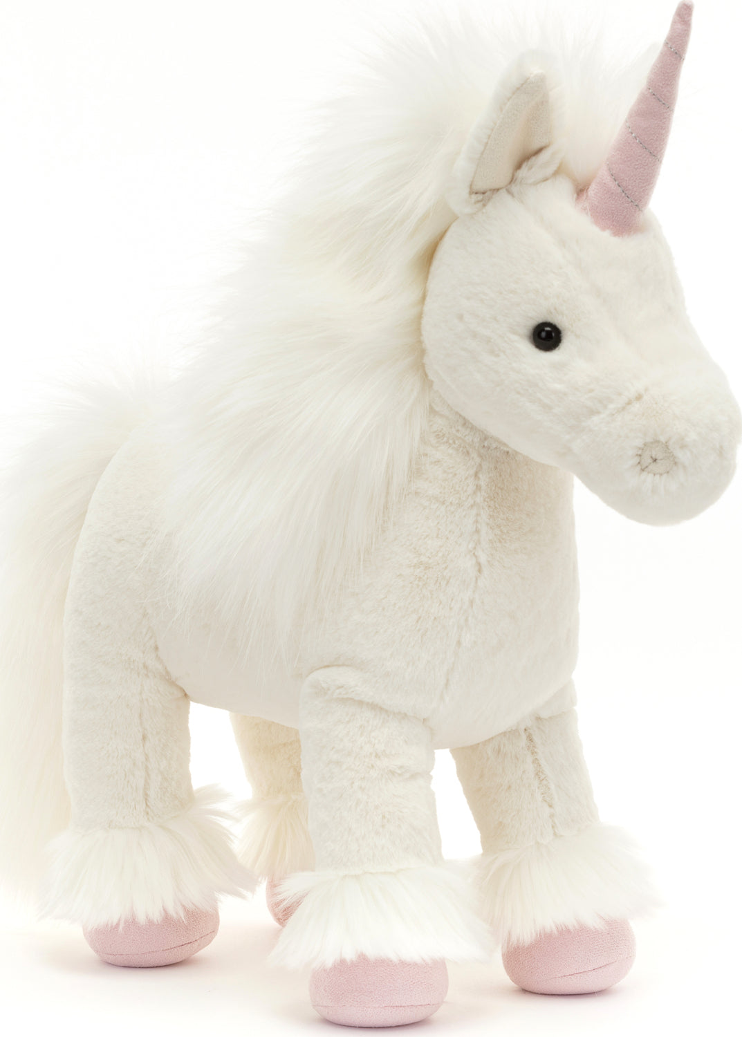 A dreamy sight in clotted-cream fur, Isadora Unicorn is enchanting. With a plume mane and tail, silky feather and a pink twist horn stitched with silver, she trots through the forest on blush suedette hooves!