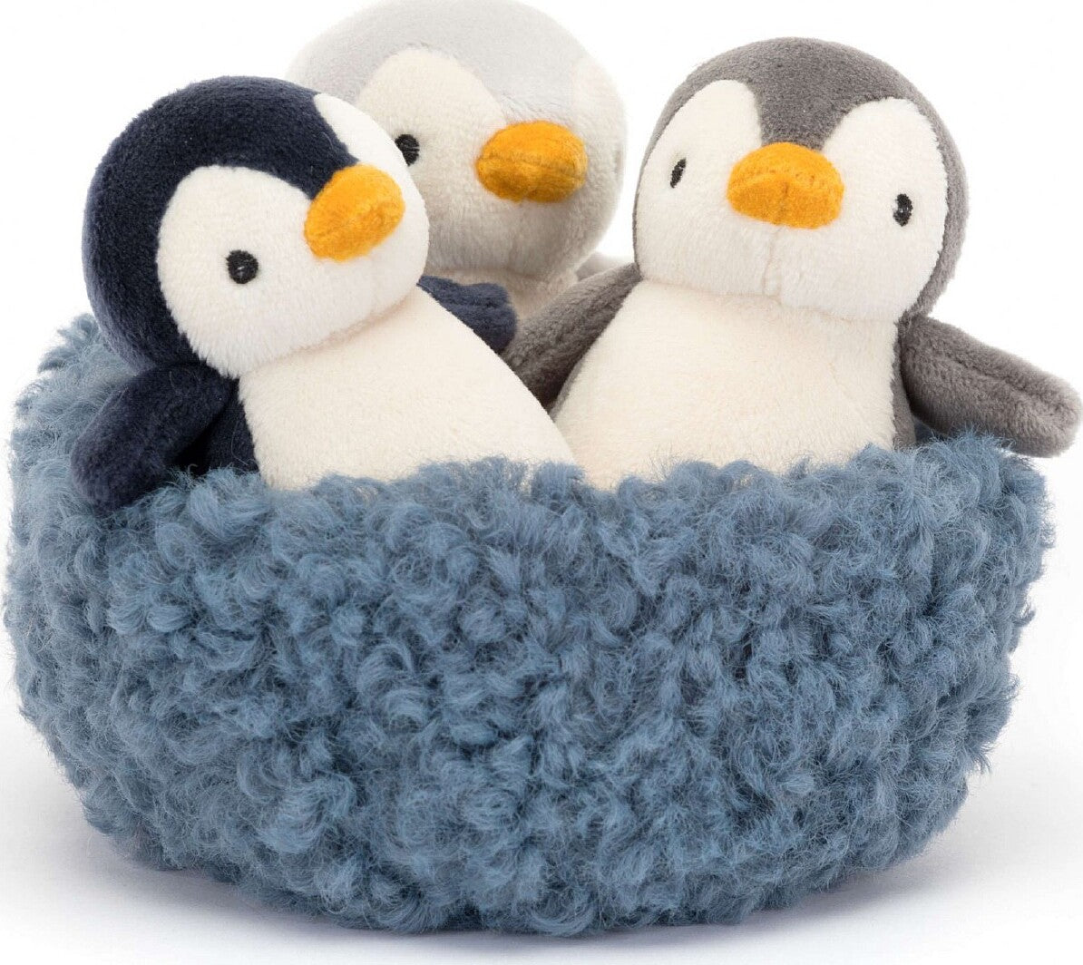 Uh-oh – here's a mischievous trio! The Nesting Penguins are three cheeky friends in navy, pebble grey and silver fur. A huddle of vanilla tummies, tiny wings and tangerine beaks, they hop in and out of their mossy blue nest!