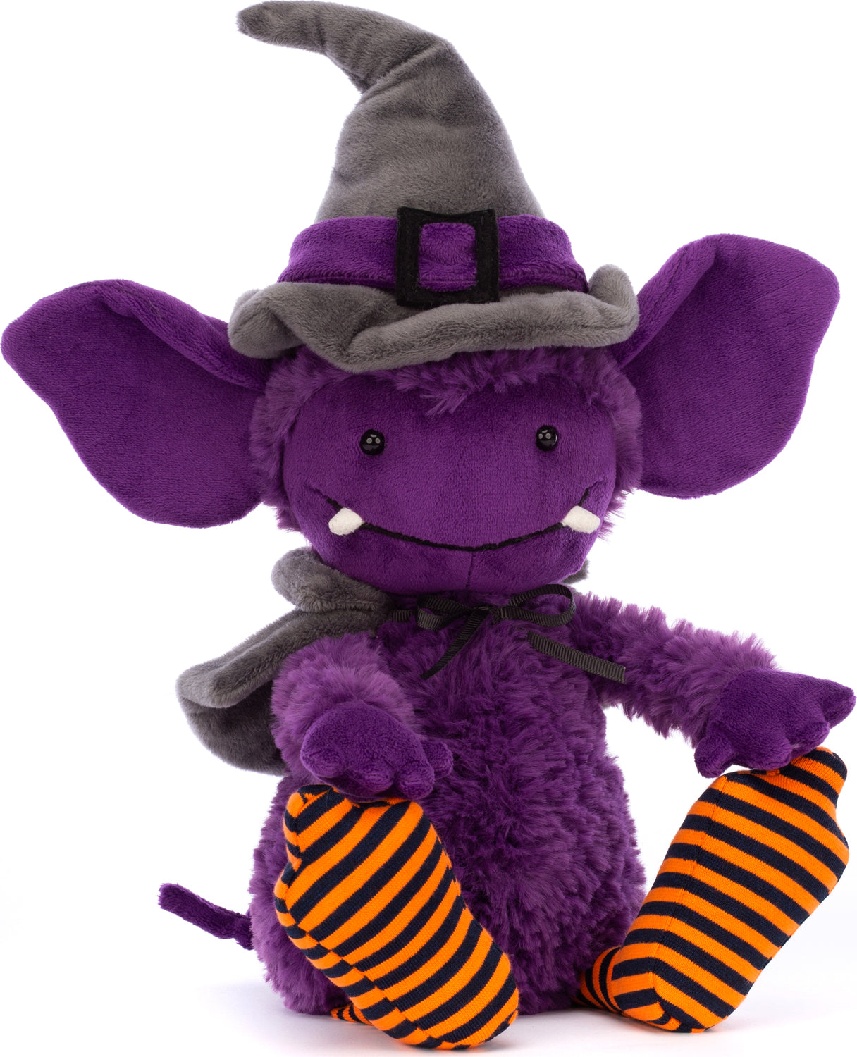 Spooky Greta Gremlin is ready to go trick-or-treating as a furry witch! This mischievous gremlin has fluffy grape fur, suedette ears and a springy curly tail. Greta wears a rumpled hat with a felt band and buckle, a cape tied with black grosgrain ribbon and funky black-and-orange socks!