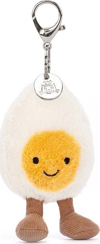 Keep your day sunny side up with Amuseable Happy Boiled Egg Bag Charm. This cream and yellow egg has a stitched smile, brown cordy boots, and a metallic clasp fix your eggs onto one basket, or bag!