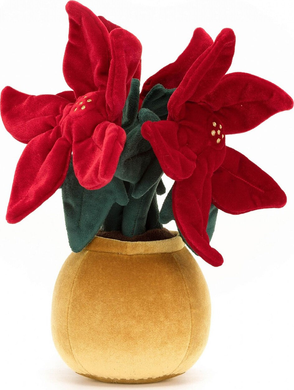 Amuseable Poinsettia is a sophisticated holiday companion! This stylish plant is such a sweet gift, with red suedette petals stitched with gold freckles, deep green leaves and sturdy stalks, in a rounded gold velour pot filled with fluffy soil.