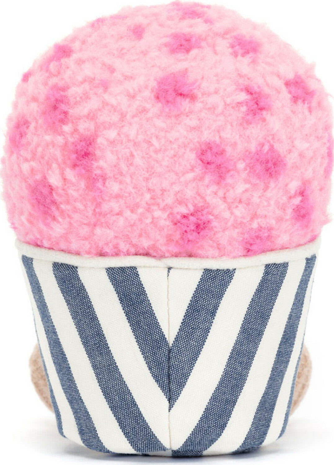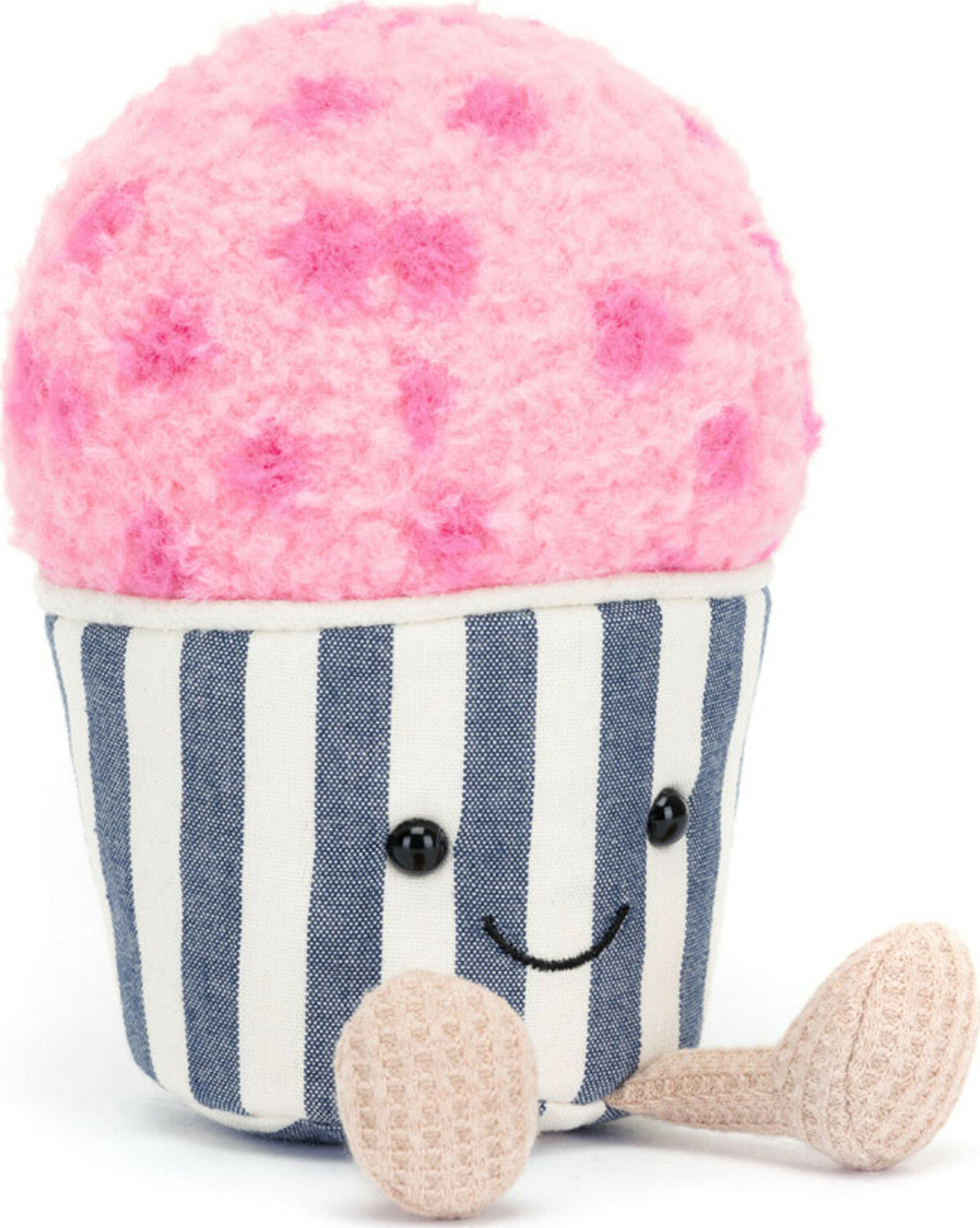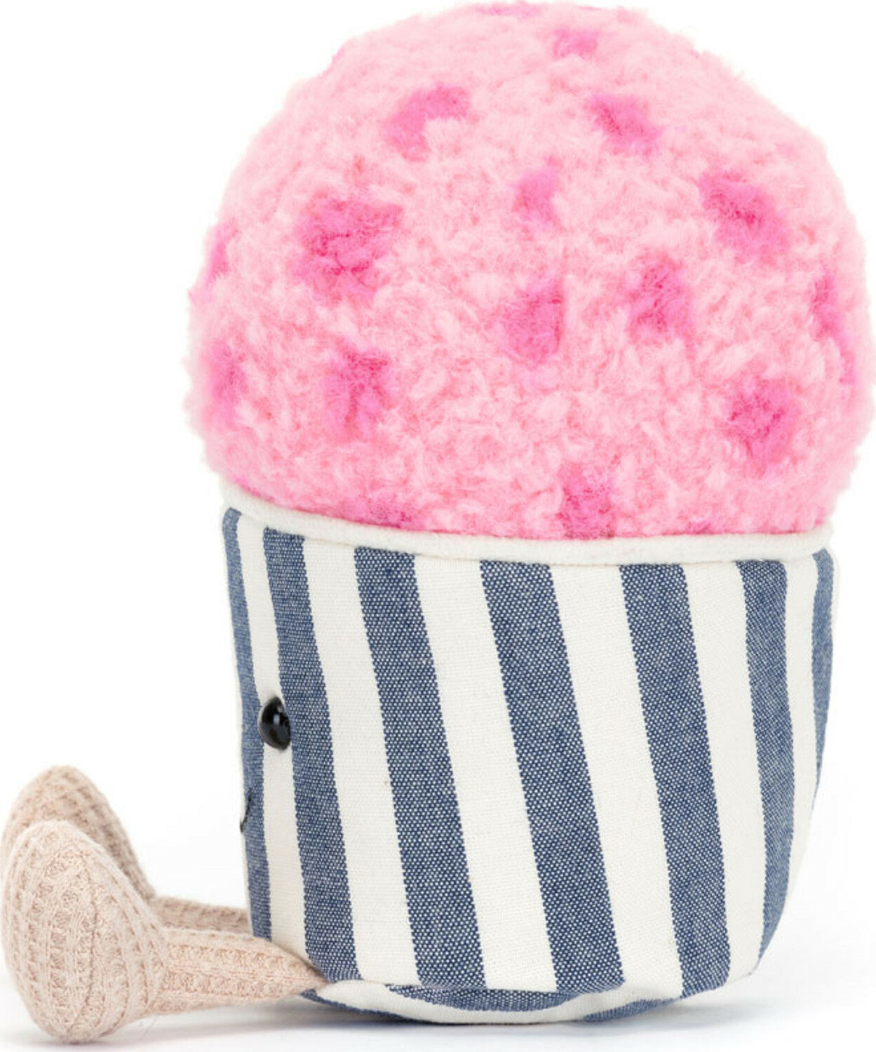 Say Ciao to Amuseables Gelato! A textured scoop of strawberry pink gelato sits in a blue and cream striped cotton cup. With waffle boots and a big, stitched smile, this sweet treat is molto bene!