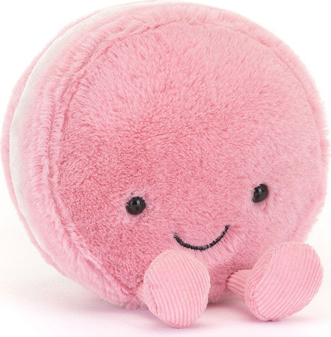 Amuseables Mia Macaron is a fruity, friendly treat in soft strawberry fur. With a velvety filling, matching cord feet, and stitched smile, Mia has an embroidered Jellycat logo on the back for a truly luxurious treat!