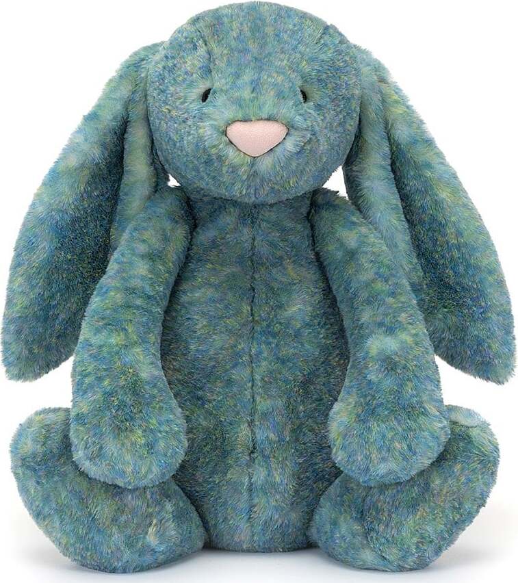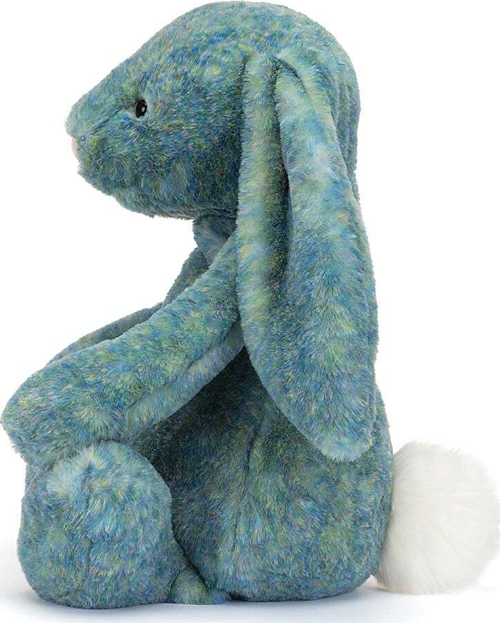 Bashful Luxe Bunny Azure is a watercolor wonder in super soft fur in shades of blue, green and yellow. With a fluffy white tail and suedette pink nose, this bunny's cuddles leave lasting impressions!