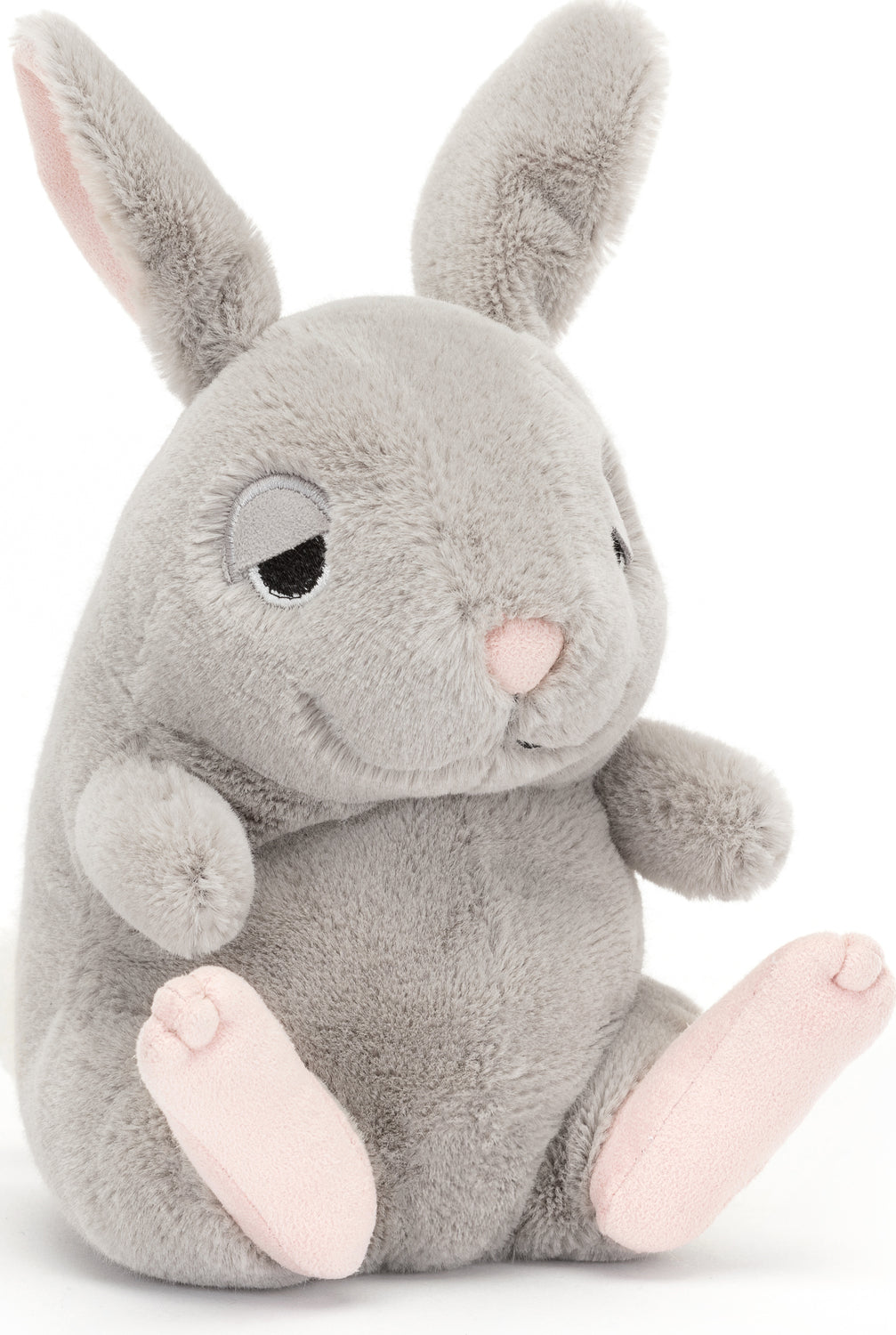 Cuddlebud Bernard Bunny is rumpled, dreamy and just the companion for peaceful dreams. This lazy grey bunny has a flopsy pose, embroidered eyes and suedette lids, with two-tone ears and pink feet with stitch toes.