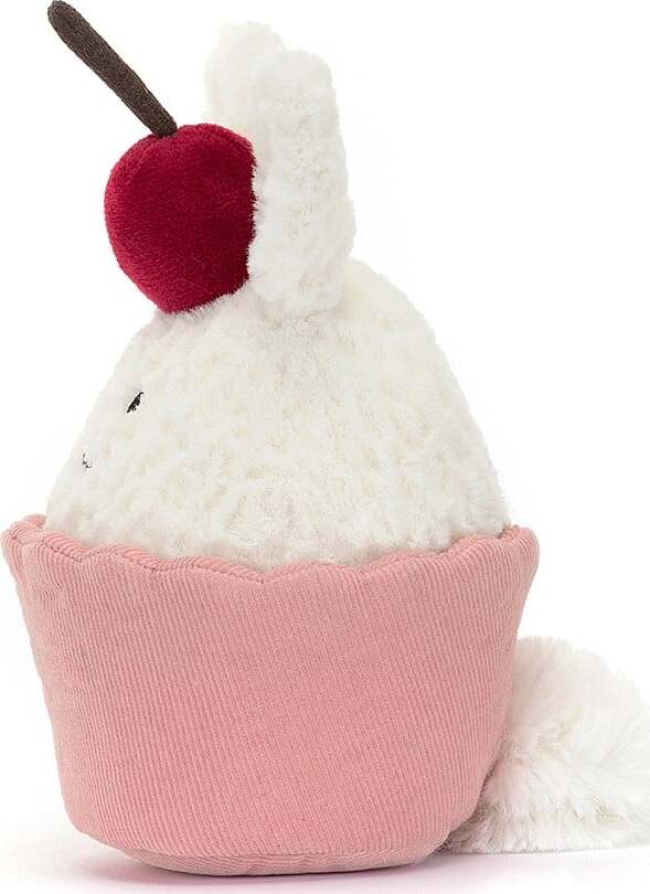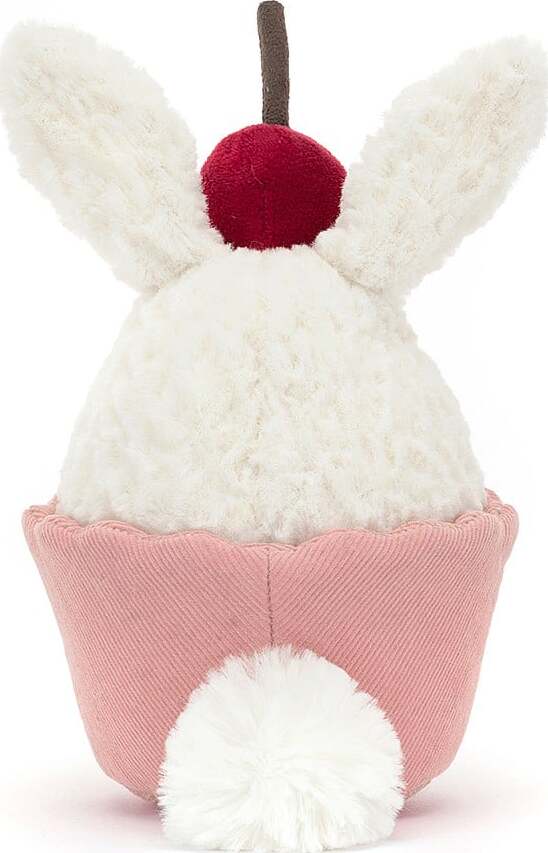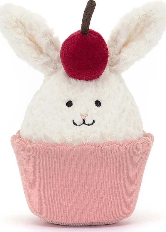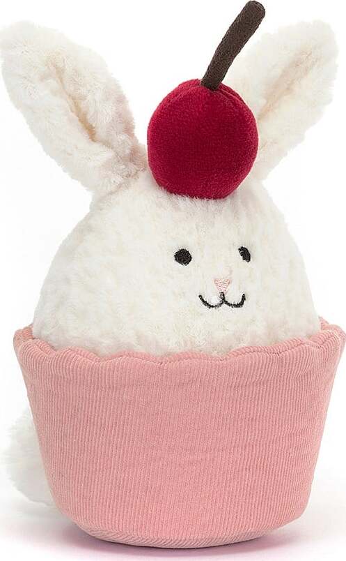 Dainty Dessert Bunny Cupcake is the ultimate sweetie! A soft bunny in textured cream icing is snuggled into a pink fine cord casing, with a fluffy bobtail and a suedette cherry on top.