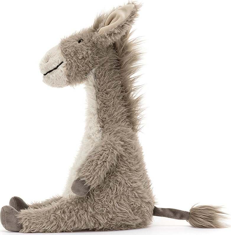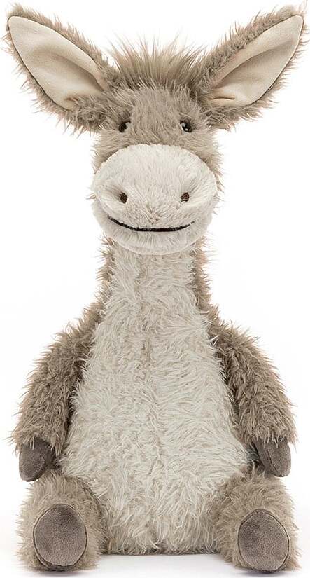 Dario Donkey is a classic cuddle companion, with grey suedette hooves, a paintbrush tail, and a silky-soft mane. With a chunky muzzle, long, fuzzy ears, and two-tone fur in mocha and cream, Dario is adventure ready.