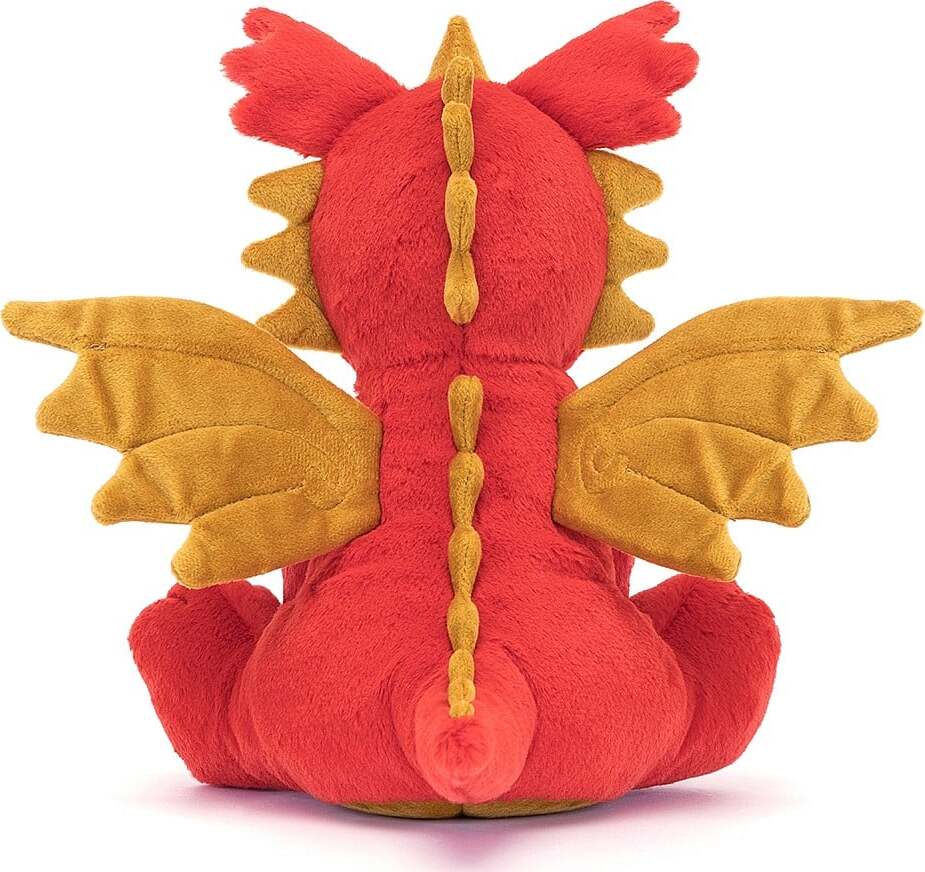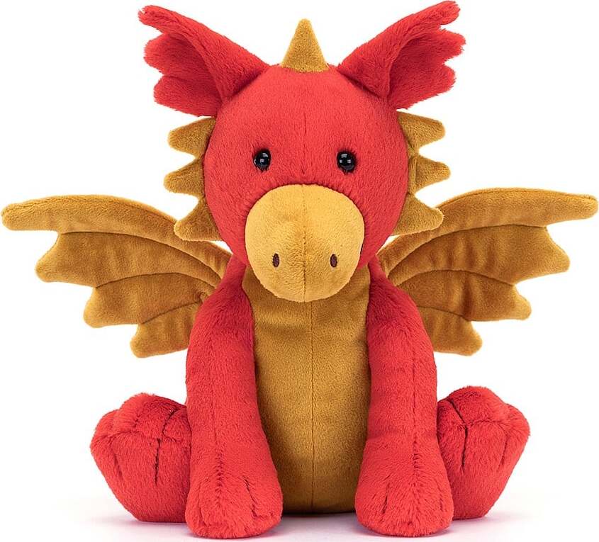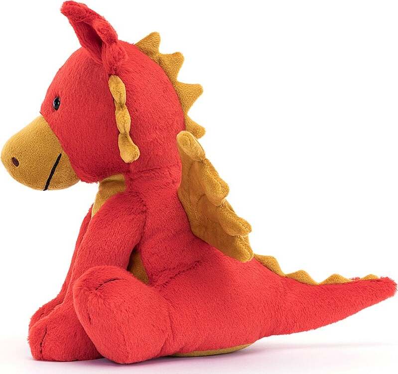 Darvin Dragon is a sweet softie in tomato red fur. With soft golden wings, tummy and snout, this smiling dragon has lots of embroidered detail to explore during story time!