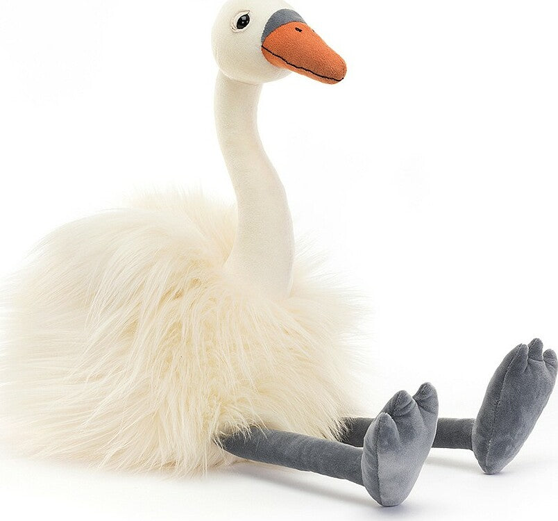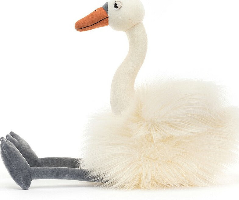 Dreamy, creamy and utterly elegant, Evelyn Swan drifts serenely down the stream! A mighty swan with a long, poised neck, suedey orange beak and a fluffy cream tutu, Evelyn has big grey feet for speedy swimming and the odd fancy waddle! She's a riverside celebrity!