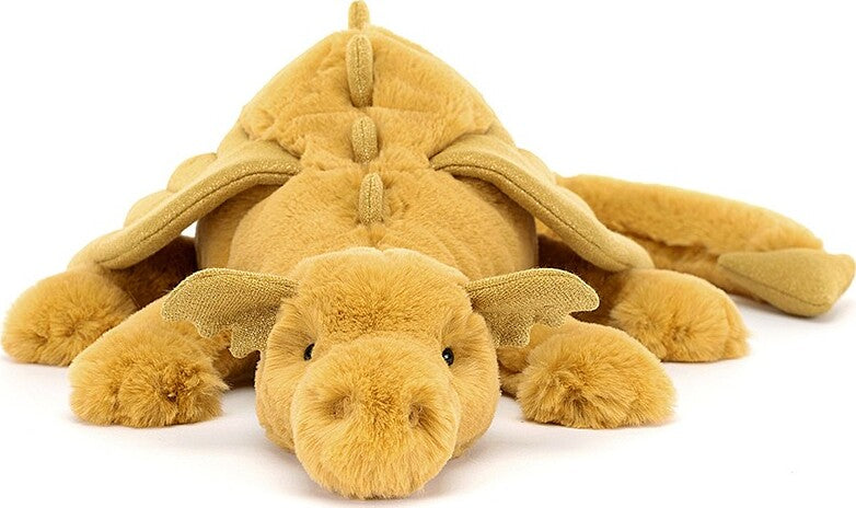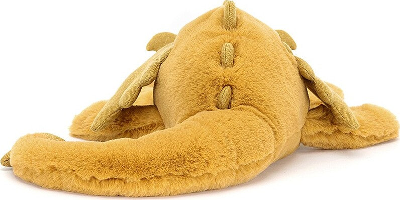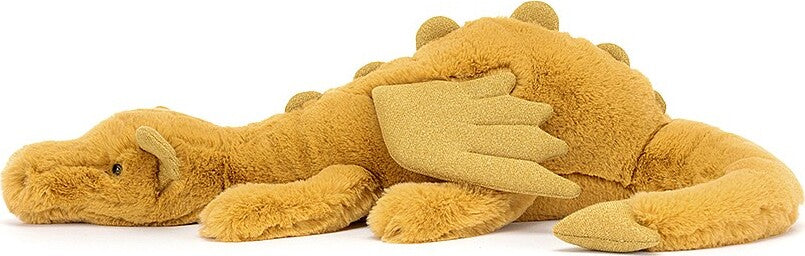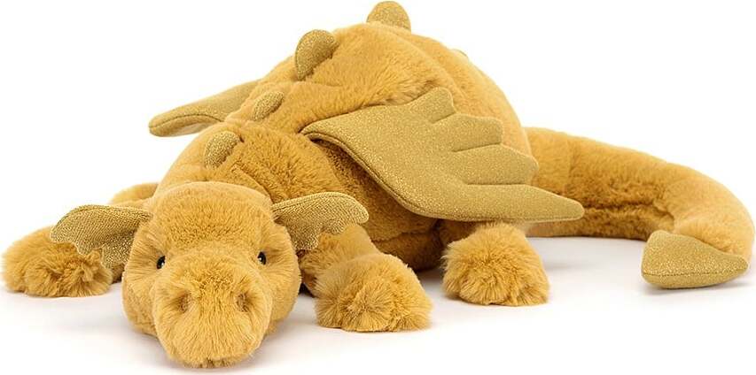Golden Dragon is a mythical marvel in soft golden fur. With glittery spines, ears, wings and tail dart, this dragon shimmers with magic, the perfect cuddle buddy for magical dreams!