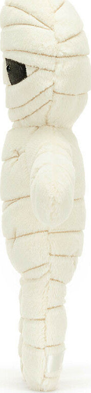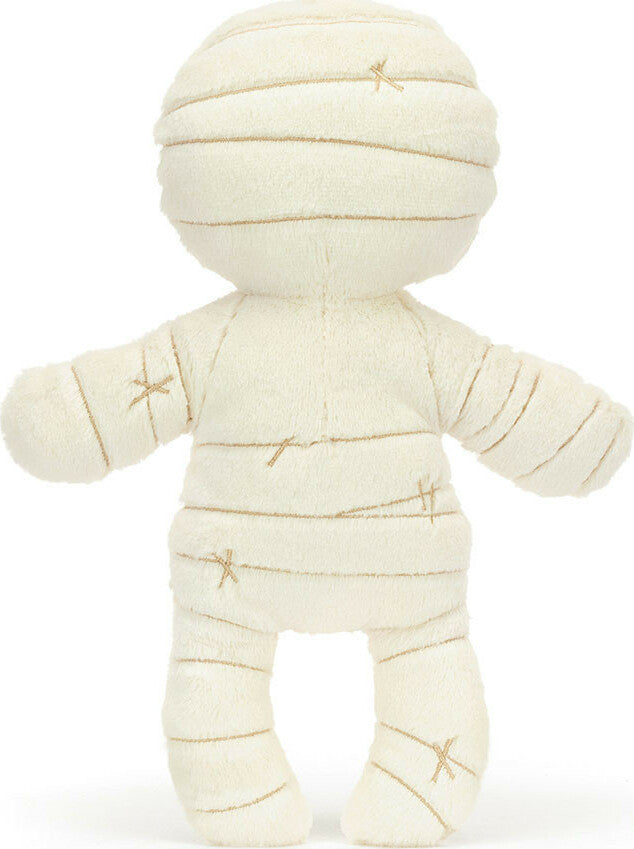 Even skeletons need Halloween costumes! Meet Mummy Bob – an undead softy in cream fur bandages, with delicate embroidered stitches. Look closely to see Bob's shiny eyes peeking out from all those layers!