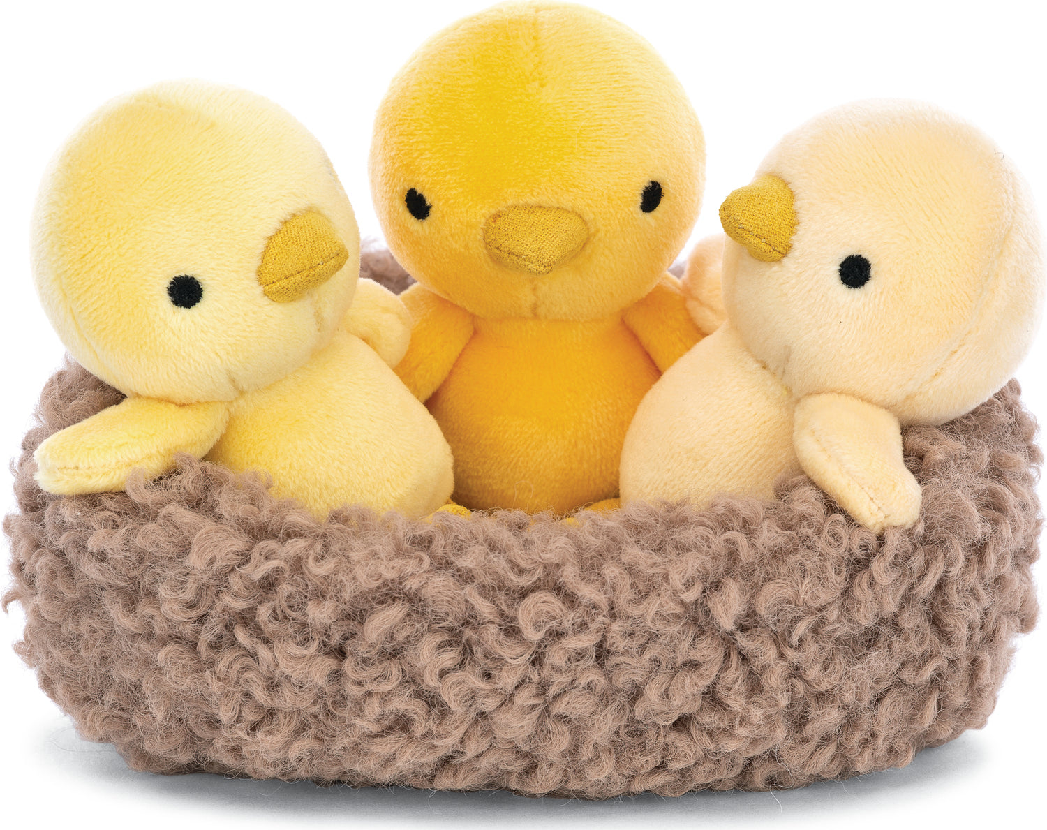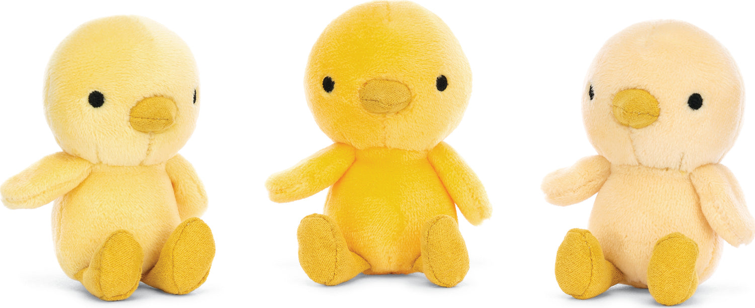 Three little Nesting Chickies, giggling away. Whether in or out of their cosy cocoa nest, these adorable chicks like to stick together. In bright dandelion, banana and sweetcorn yellows, they're a chirpy, fluffsome bunch perfect for springtime fun!