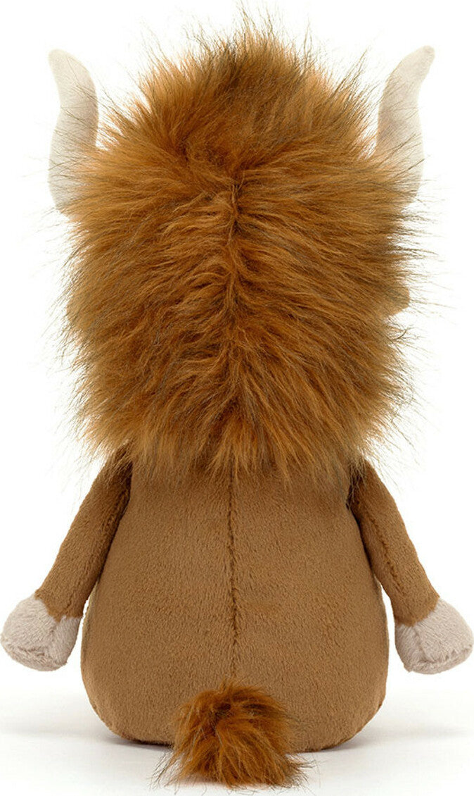 Ramone Bull has a wild mane of silky fur in ginger and charcoal. This sturdy bull has beige suedette horns, a cinnamon tum and a tassel tail. Ramone's got a huge stitched nougat nose and matching cloven hooves.