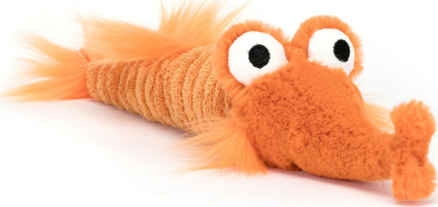 Riley is one quirky Razor Fish. Bright and bold in orange cordy fabric, Riley has fluffy fins and a nose of iconic Bashful fur. With wide eyes and lips pursed, Riley's ready to swim!