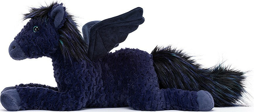 Seraphina Pegasus has come down to earth, but this swift sky-pony is dreaming of zooming! A magical mystery with midnight fur ruffled and scruffed by the chilly wind, Seraphina soars high on broad stitch wings. With soft sheen hooves, a snuggly muzzle and a fluffy mane streaked with electric blue, this pegasus is perfect.