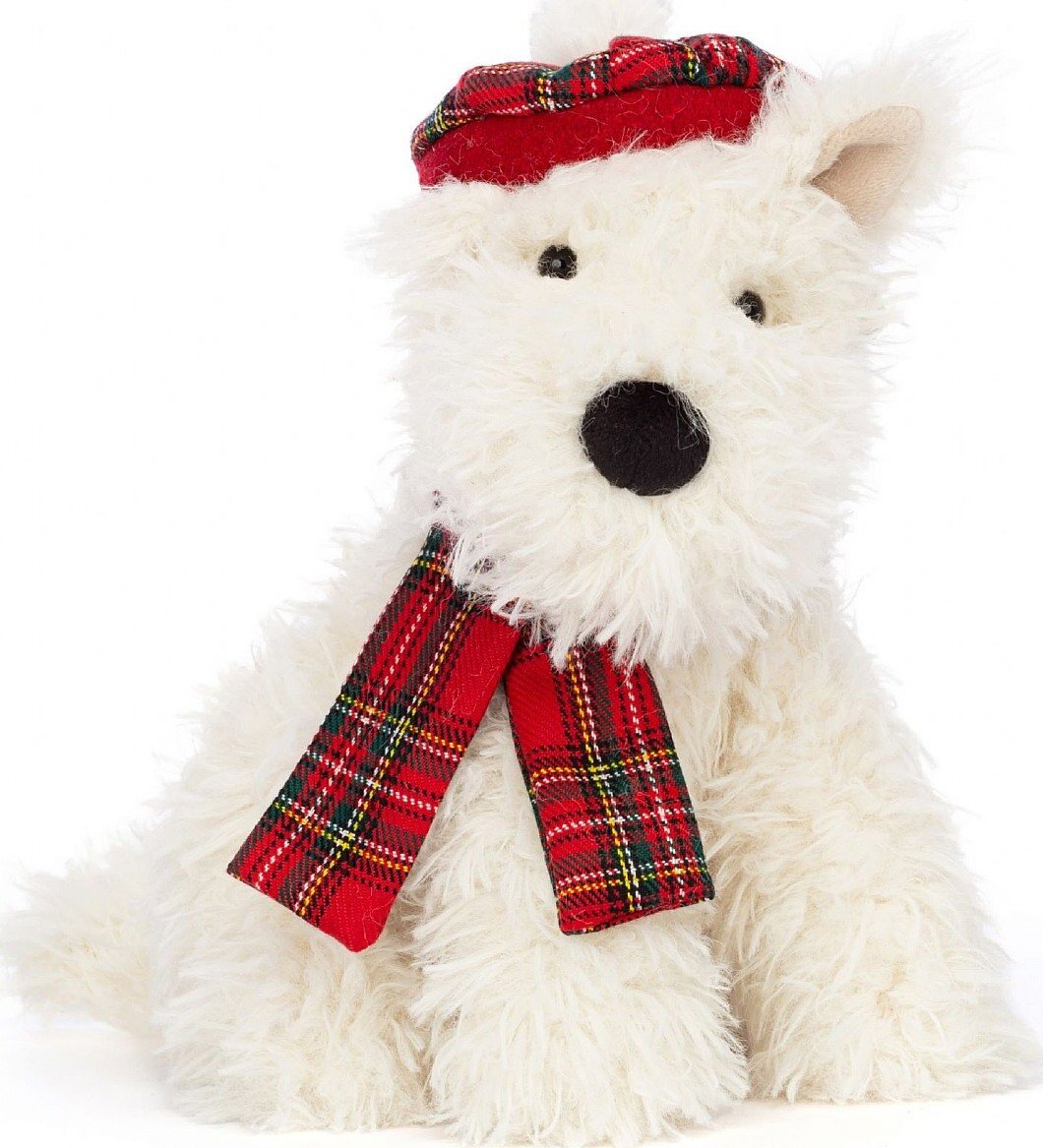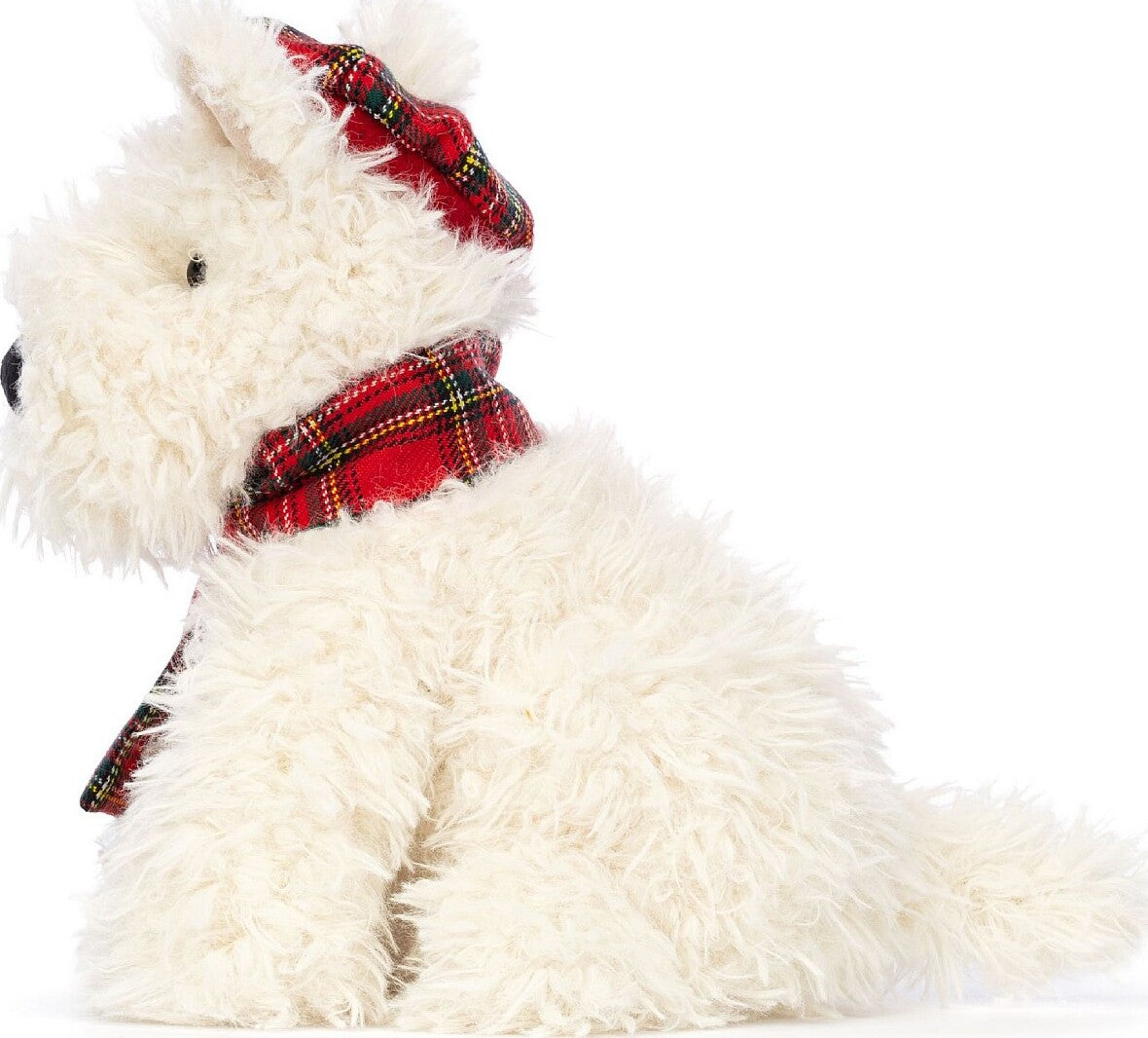 Winter Warmer Munro Scottie Dog is snuggled up against the cold! Wearing a red tartan tam o' shanter and matching crossover scarf, this wee dog is plenty cosy! With gorgeously shaggy porridge fur, a black nose and pink inner ear, Munro is the pup for toasty cuddles.