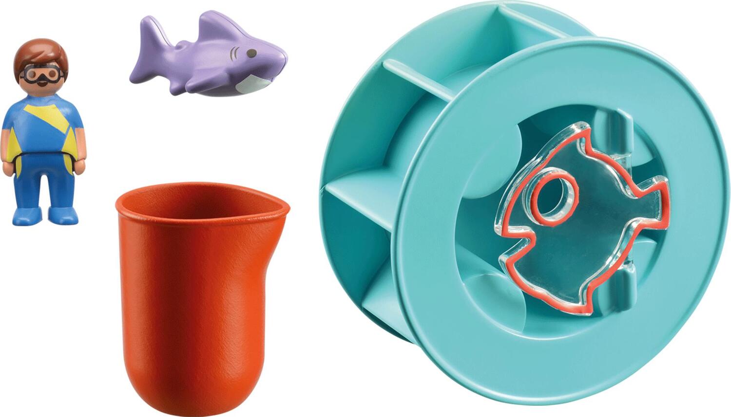 Ready for some splashing good times? With the Water Wheel with Baby Shark, bathtime fun reaches a whole new level. Simply attach the water wheel to the wall or side of the tub using the suction cup. Then, place the figure inside and close the fish door. Now the real action begins! Fill the cup with water and pour it over the wheel to make it spin. The colorful playsets from PLAYMOBIL 1.2.3 AQUA each playfully promote important developmental skills. This Stage 3 - Little Expert set will help your toddler develop cognitive and fine motor skills, all while having a great water play experience! Playset includes one figure, floating shark, water wheel, and a cup for pouring.