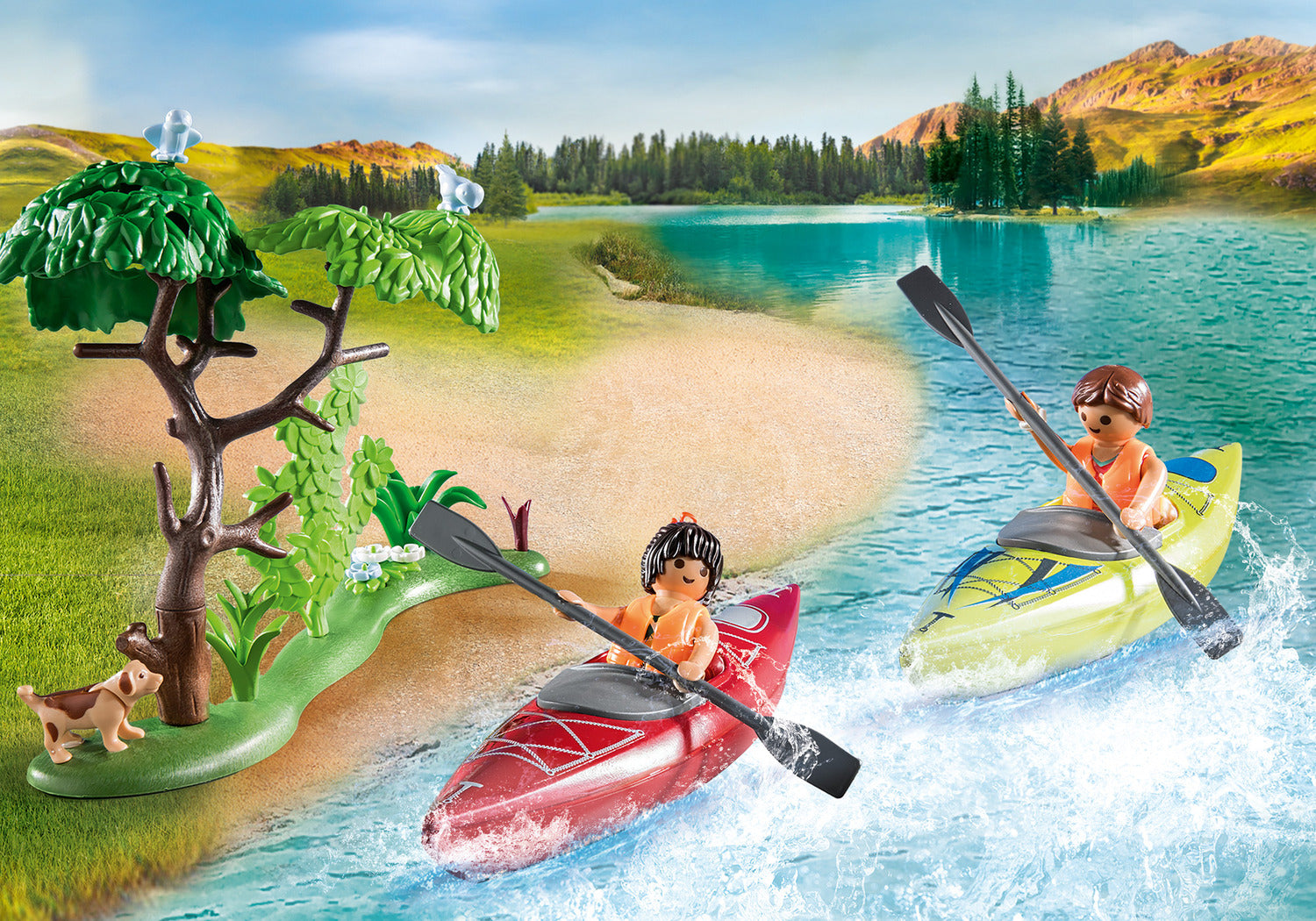 Figures: 1 man, 1 woman; Animals: 1 bird; Accessories: 1 tree stump, 1 lamp, 1 disc, 1 stove, 1 pot, 1 radio, 1 can, 1 can of sausages, 1 box, 1 pan, 1 tree, 1 bottle, 1 tent, 2 canoes, 2 paddles, 1 backpack