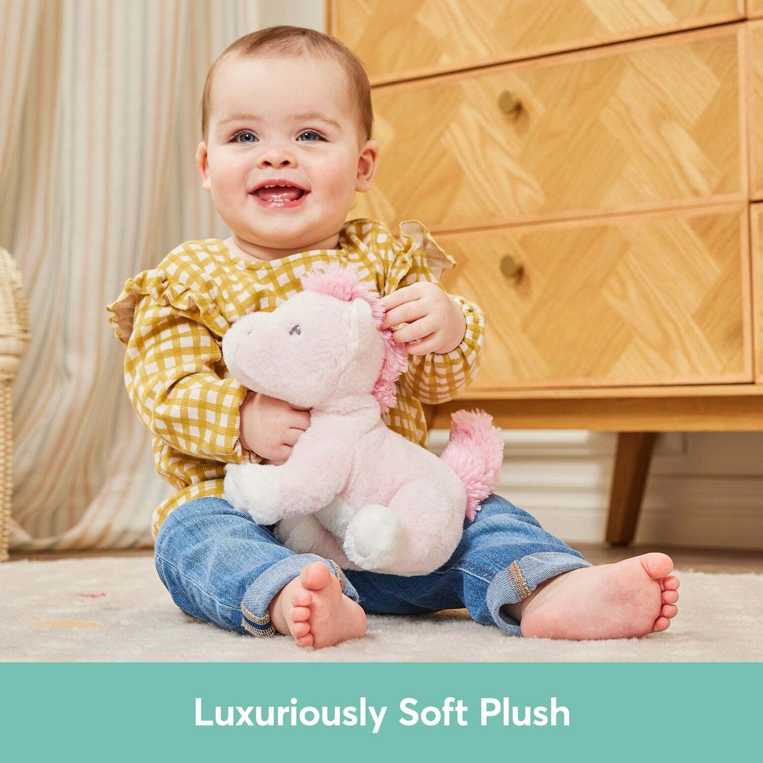 This super-cute and slightly floppy 10" pink unicorn relaxes in a playful downward pose, ready to snuggle or snooze with baby. Alora features embroidered details, soft fabric, and a shiny silver satin horn for additional tactile play.