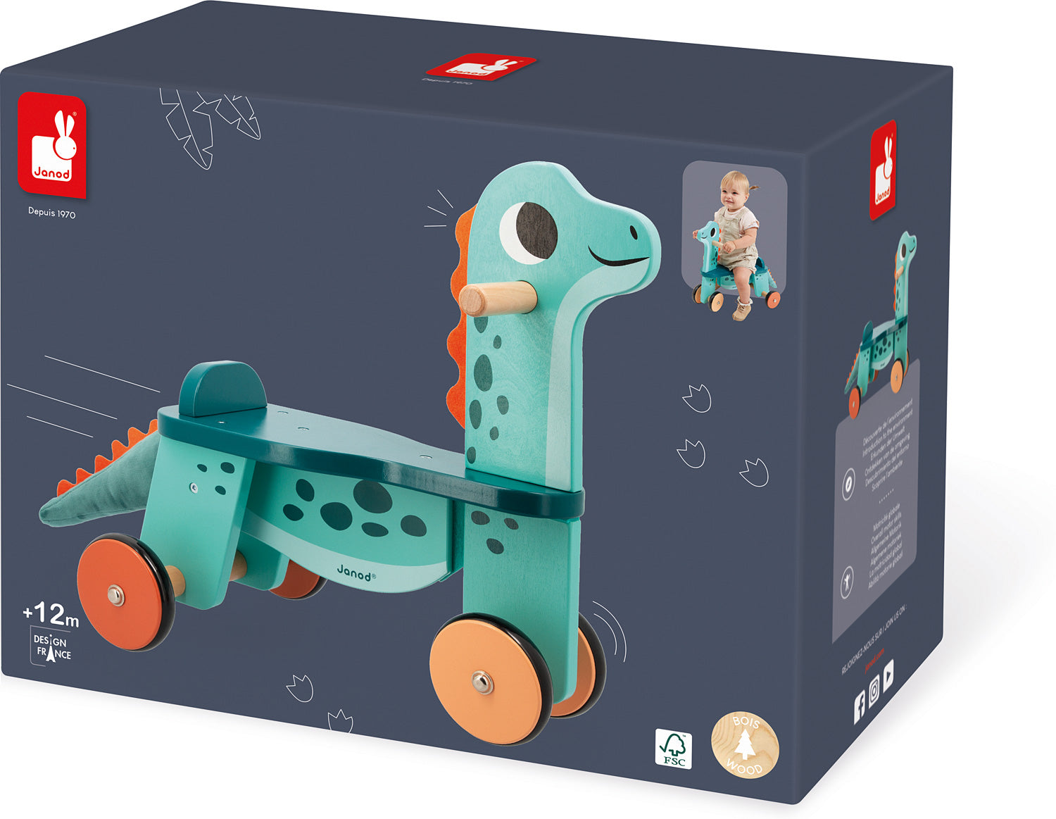 Make way for dinosaurs! Toddlers have a dino-mite time building confidence and stability skills on a Jurassic steed. This wooden balance bike is easy to climb on, and features 4 ultra-stable silicone-fitted wheels. The thoughtfully designed seat is comfortable to sit on while scooting along, turning the head to change direction. The plush dinosaur tail is removable and hand washable in case it gets dirty during indoor or outdoor journeys! This awesome ride-on is made from FSC wood and measures 22.44" x 11.81" x 18.11".