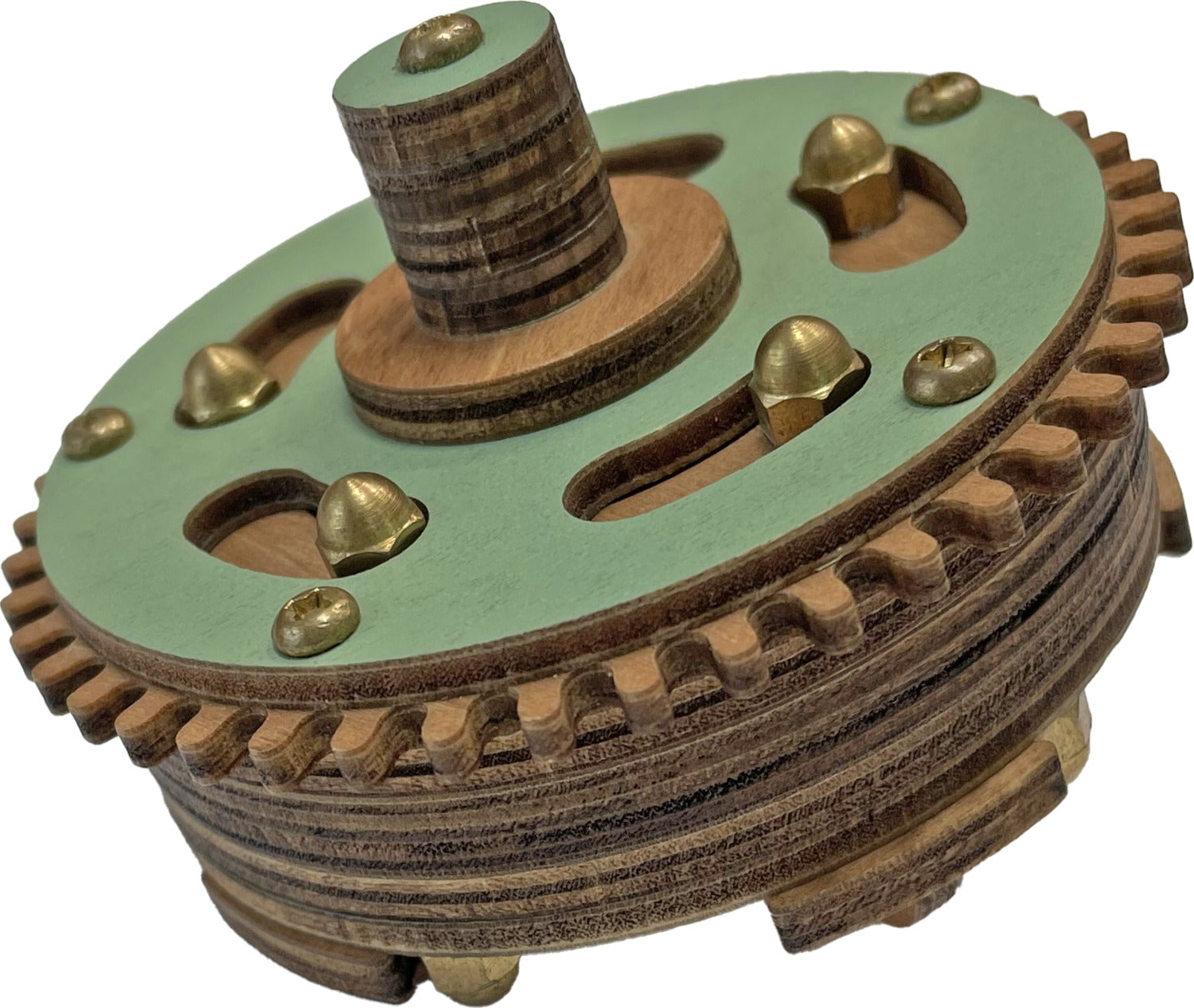 Inspired by Archimedes' use of mathematical precision, this set of interlocking gears relies on imagination and resourcefulness to solve. At its core, this extraordinary puzzle features an array of metal pins strategically positioned to hold the gears in place. Discover the detachable element responsible for disengaging the magnetic pins, allowing the gears to shift and separate. Delicately separate the top and bottom layers to expose the hidden force that unites the gears.