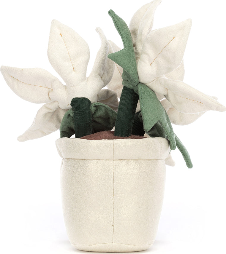 Amuseable Gold Poinsettia is looking very proud, and no wonder! Check out that crown of white-chocolate petals with suedey fur and spiffy gold stitching! With bluey-green leaves, a strong cordy stalk, a glittery pot and milk-chocolate cord boots, this little plant is pretty perfect!
