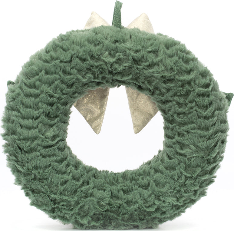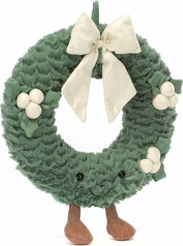 Evergreen and ever-glam, Amuseable Gold Wreath makes any door divine! Plump and tufty with a handy loop, yummy green fur, waggly booties, bobbly berries in sparkling gold, suedey leaves and a fine gold bow, this wreath gives a wonderful welcome!