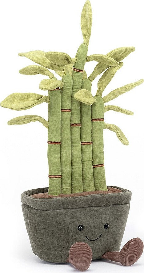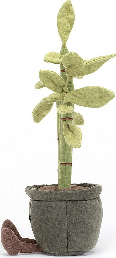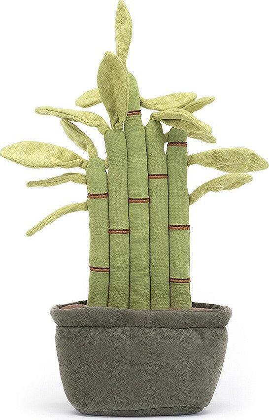 Amuseable Potted Bamboo is a stand-out star, with a groovy hairdo of five sturdy stalks! With green linen stems, red-brown stitch details and soft suedey leaves, this perky plant sits in a snug suedey pot. With fluffy soil, rusty cordy feet and a cheery smile, it's all aboot bamboo!