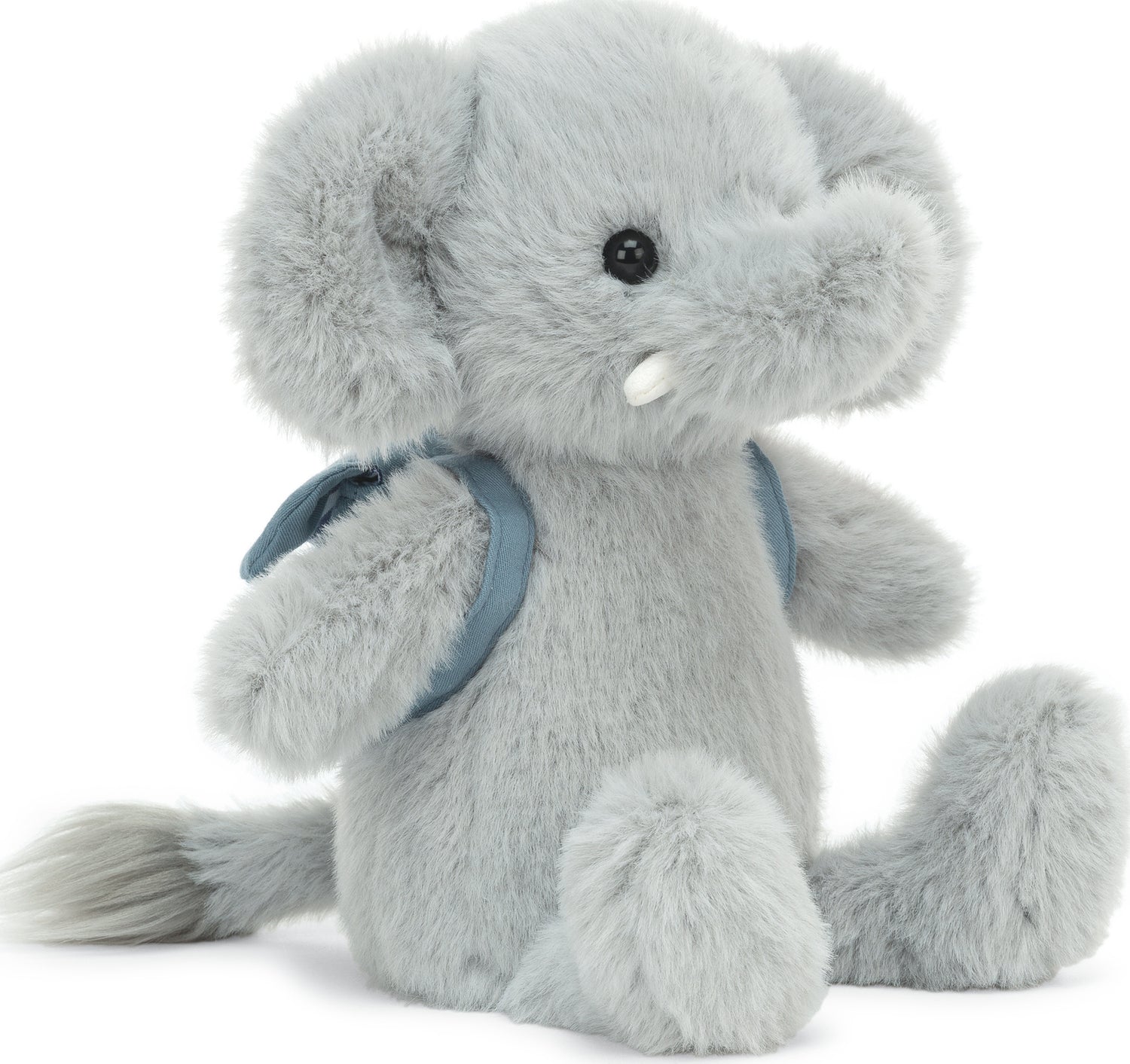 Backpack Elephant's ready for the hike! This tusky, fuzzy grey pack-yderm hasn't forgotten a single item, but needs to get a move on! With tufty tail, blue linen backpack and trunk raised quizzically, you can stomp out in style with this softy by your side!