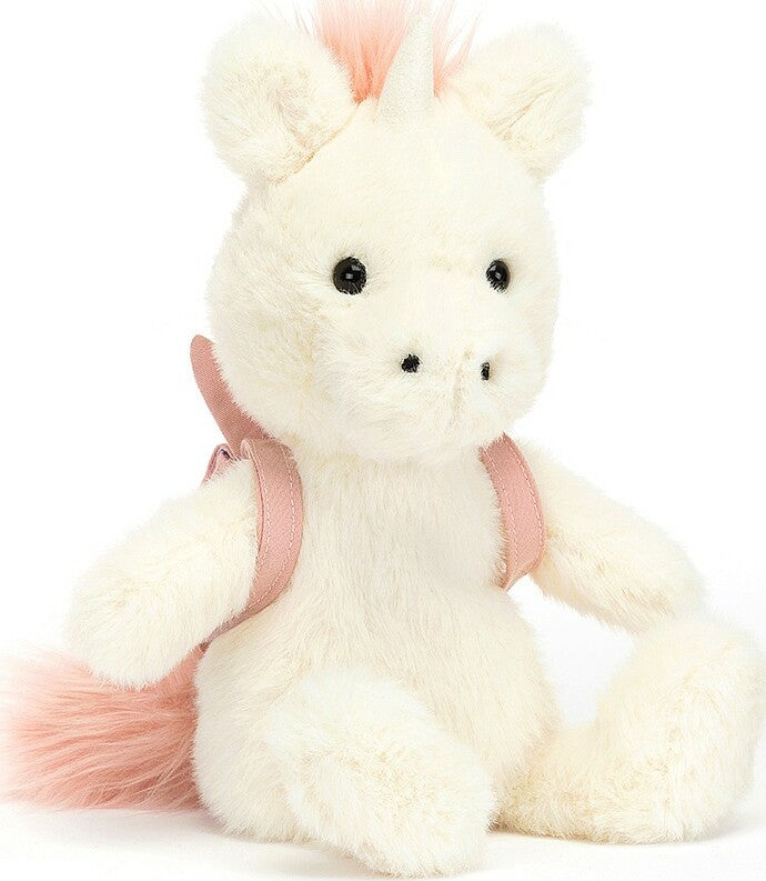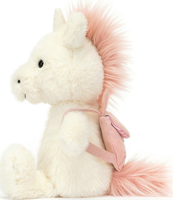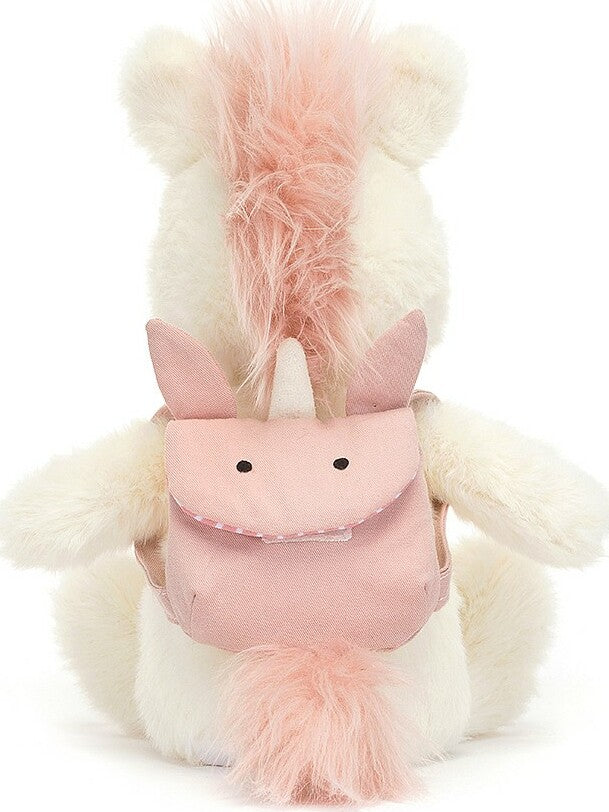 Backpack Unicorn is off on a quest! This brave little foal has tussle cream fur, a petal-pink mane and matching tail, and the sweetest suedey horn. Their unicorn backpack is fully lined and perfect for tiny supplies! With tufty ears, supersoft hooves and big bright eyes, this is one magical rambler!