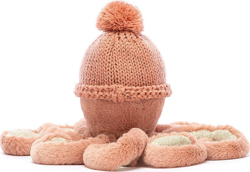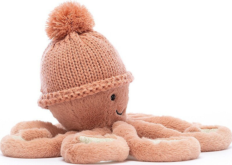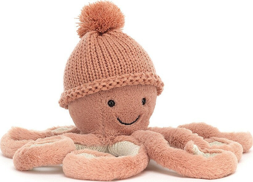 It gets a bit chilly in the ocean sometimes. That's why Cozi Odell Octopus wears a peachy knit beanie on that squishy-soft head! This tiny tickly trendsetter has a cheery grin for every selfie, and eight curly arms with cream cordy segments!
