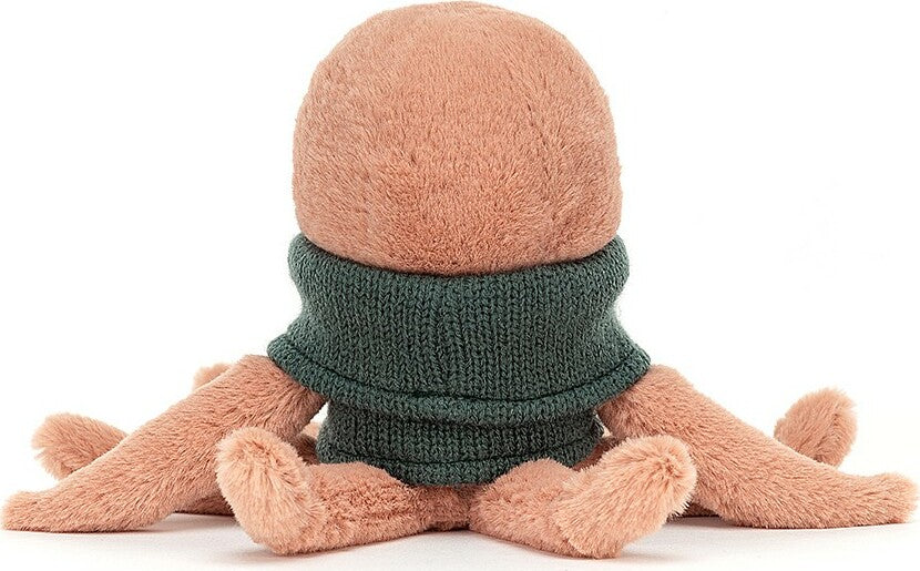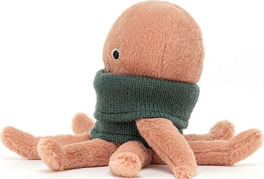 Merry mariner Cozy Crew Octopus looks so cool in a bottle-green jumper! With salmon-pink fur, a chipper grin and a brilliant squishy-soft head, this octopus gives such comforting hugs. A marvellous multi-tasker who can steer the ship while hoisting the anchor!