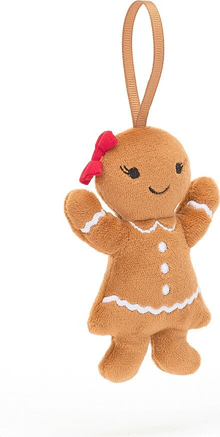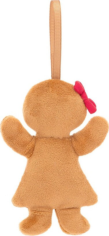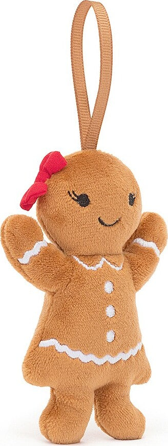 Festive Folly Gingerbread Ruby is ready to celebrate! This snuggly biscuit has a red cotton hair bow, embroidered lashes and a grosgrain loop. Ruby's always prepped for a Christmas party, with embroidered icing buttons.