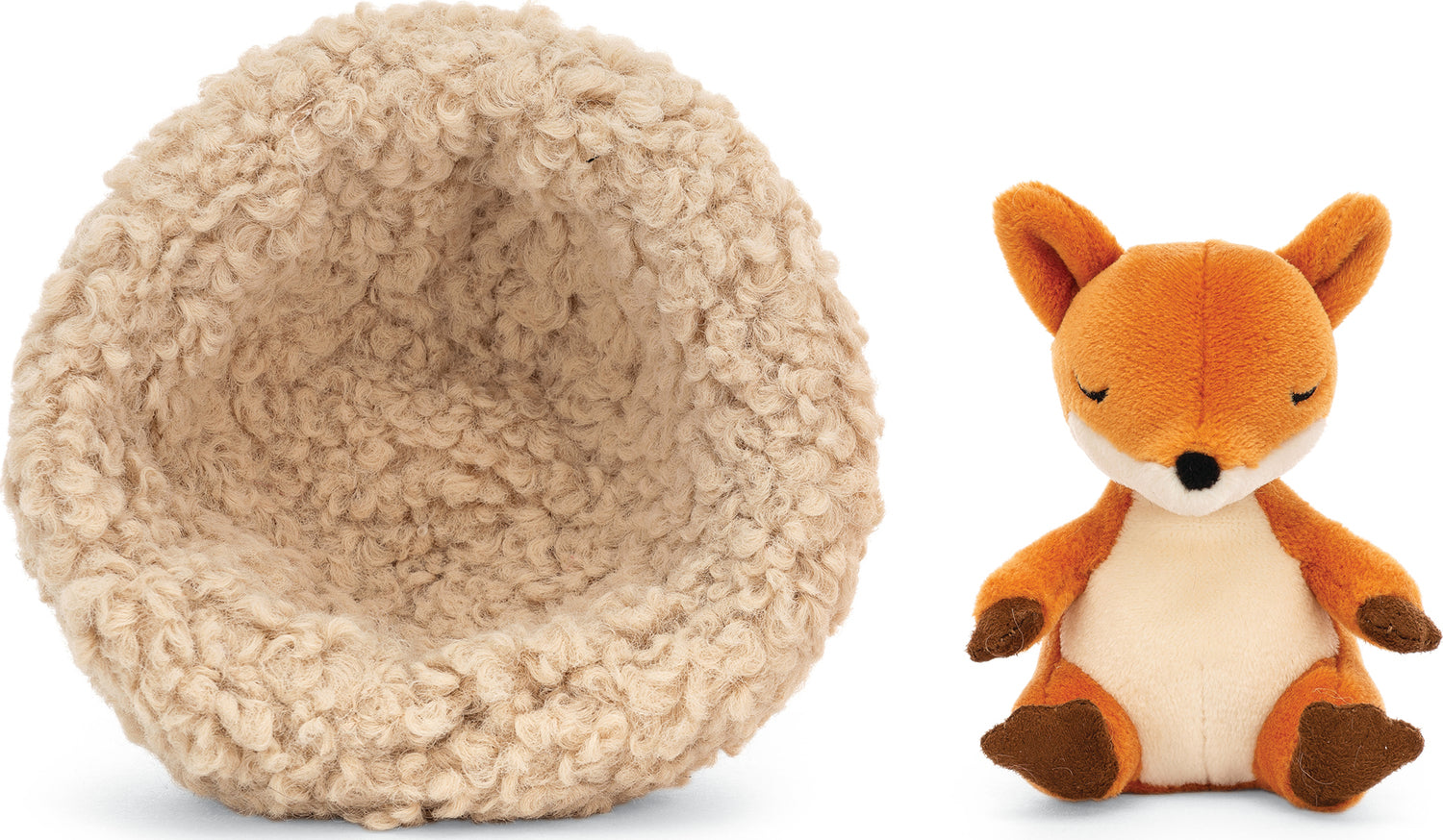 Tiptoe closer and take a peek - Hibernating Fox is fast asleep! This scrummily stretchy ginger-cream cub has made a fleecy oatmeal nest. Snoozing away, with eyes sweetly shut, tail tucked in and foldy ears up, this sleepyhead is snuffly-snug!